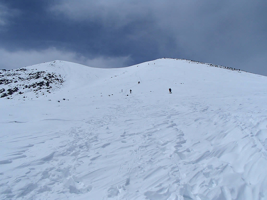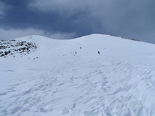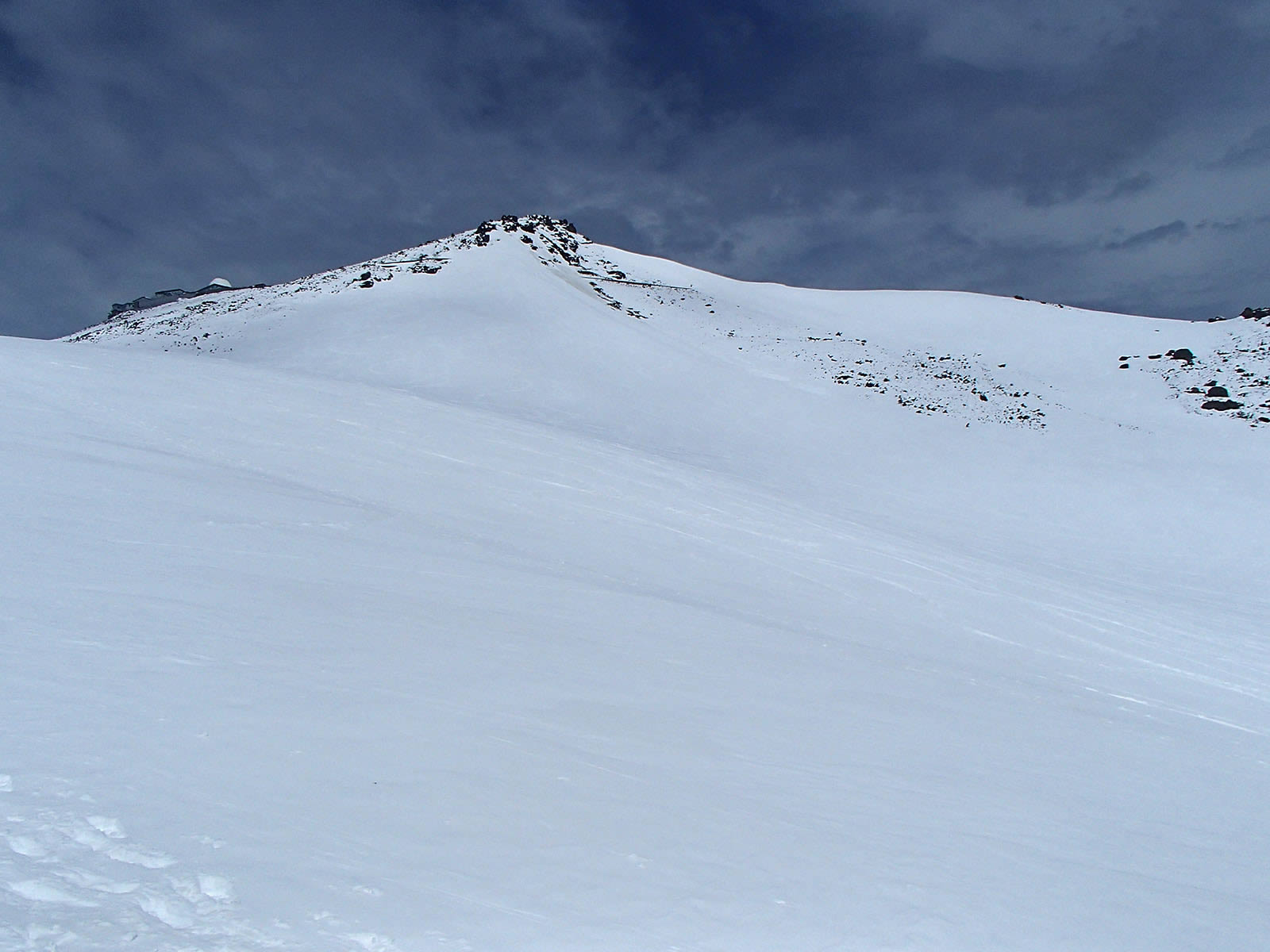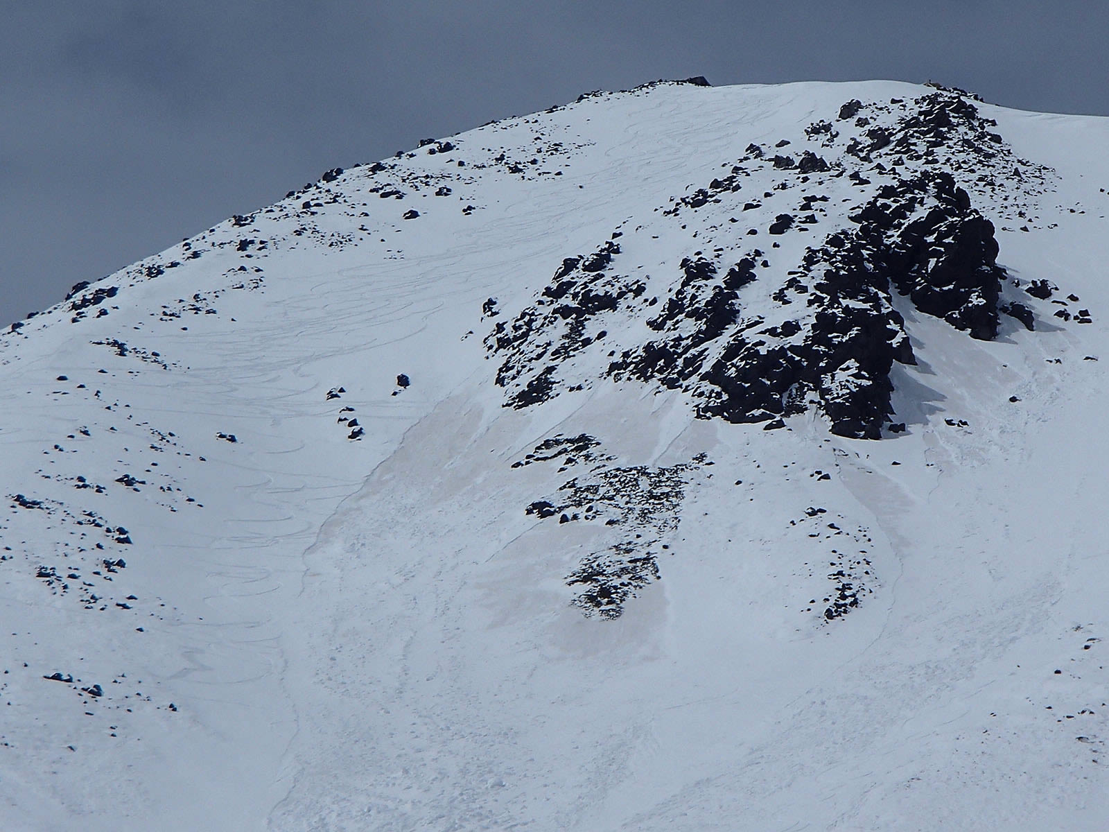 剣ヶ峰をズーム。斜面は多くの人が滑ってぎだぎだ気味です。