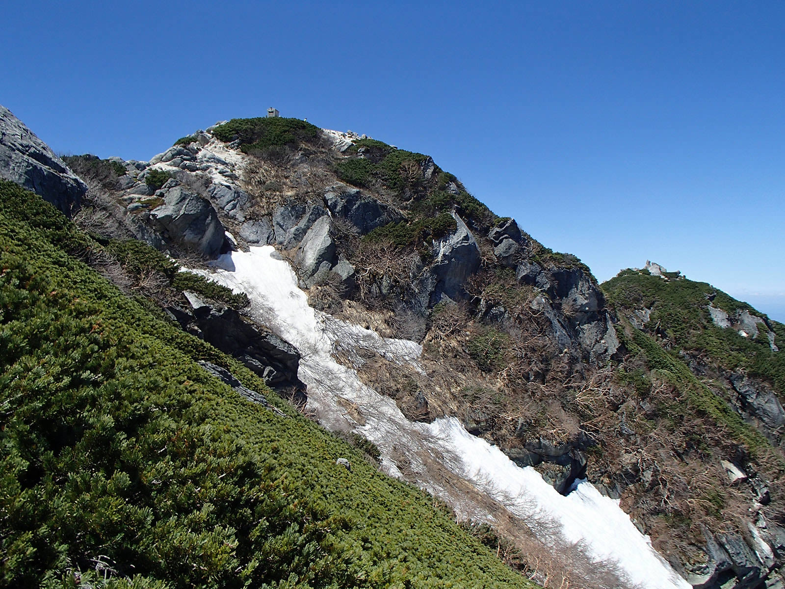 間もなく登山道上に残雪が出てきました。そんなに長い距離で無いのと、ステップがあってゆるんでもいましたので滑り止めは付けませんでした。帰りも同様。
