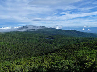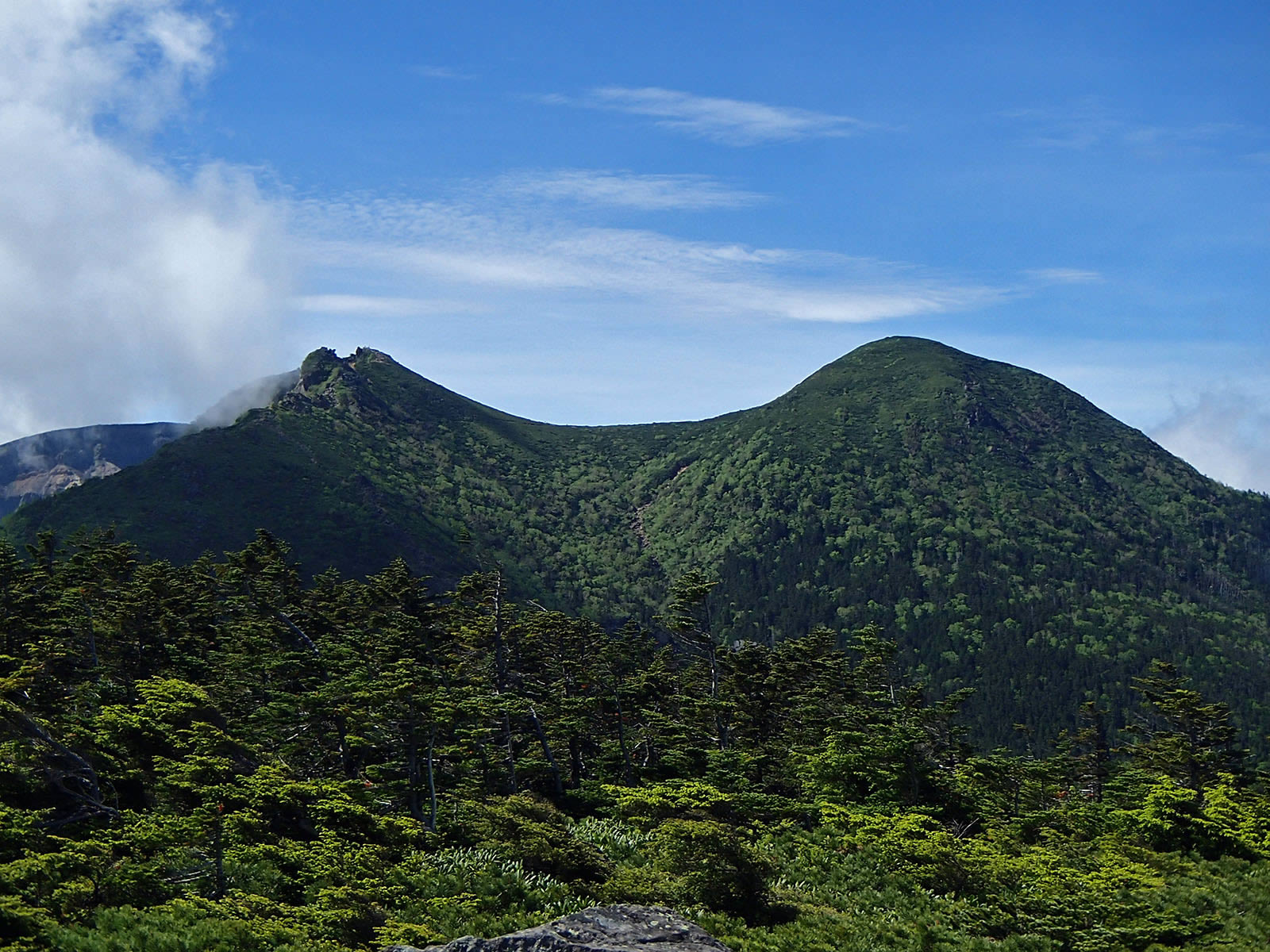 その先の展望台から振り返ると、早くも天狗岳にガスがかかり始めていました。もう夏ですから。
