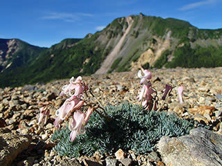 コマクサと天狗岳。ここのコマクサは白っぽいものが多いです。