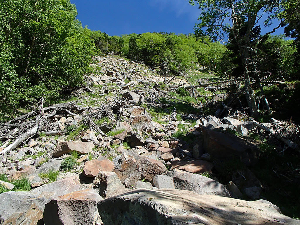 崩落地に出ました。ここはほぼ真横に渡れば良いでしょう。私は歩きやすいルートを探して少し上側を渡りました。