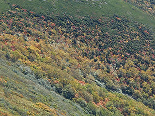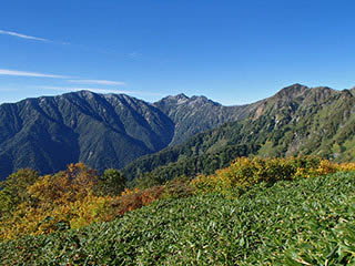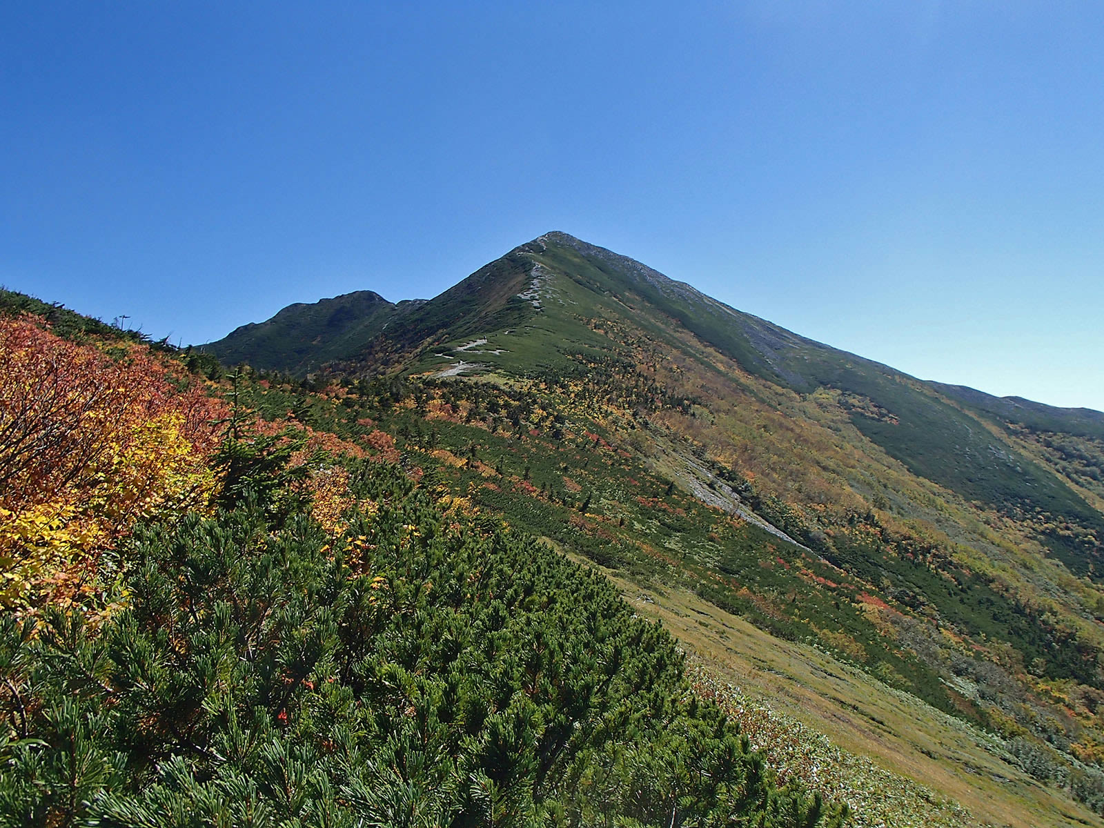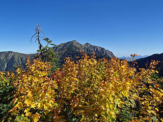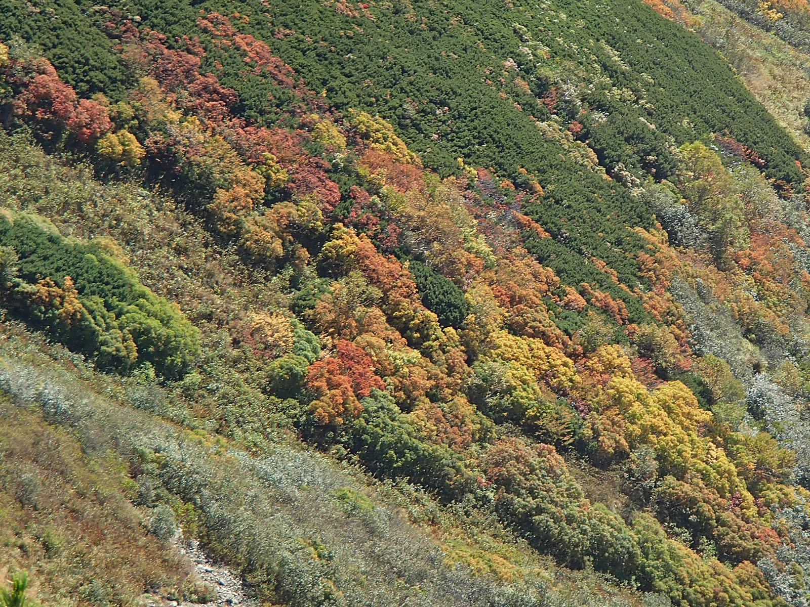 稜線から下った斜面の紅葉は部分的に色付き始めという感じでしたが、でも紅葉の色合いは良い感じで、こちらも楽しめました。