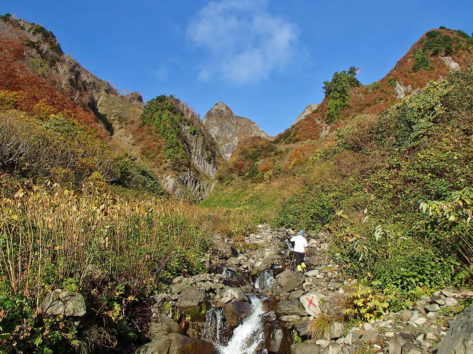 荒菅沢を見上げます。ちょうどガスが(^^;。