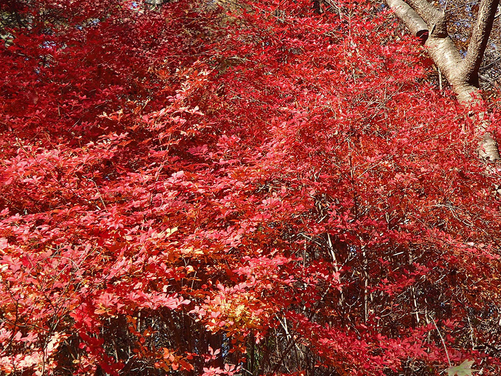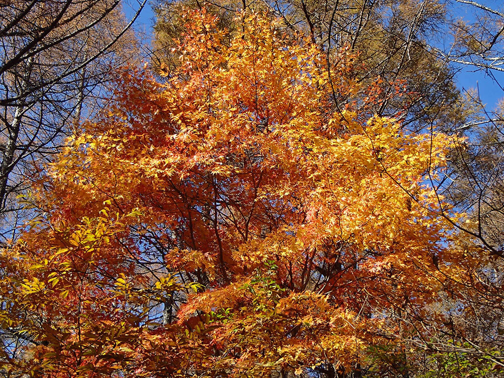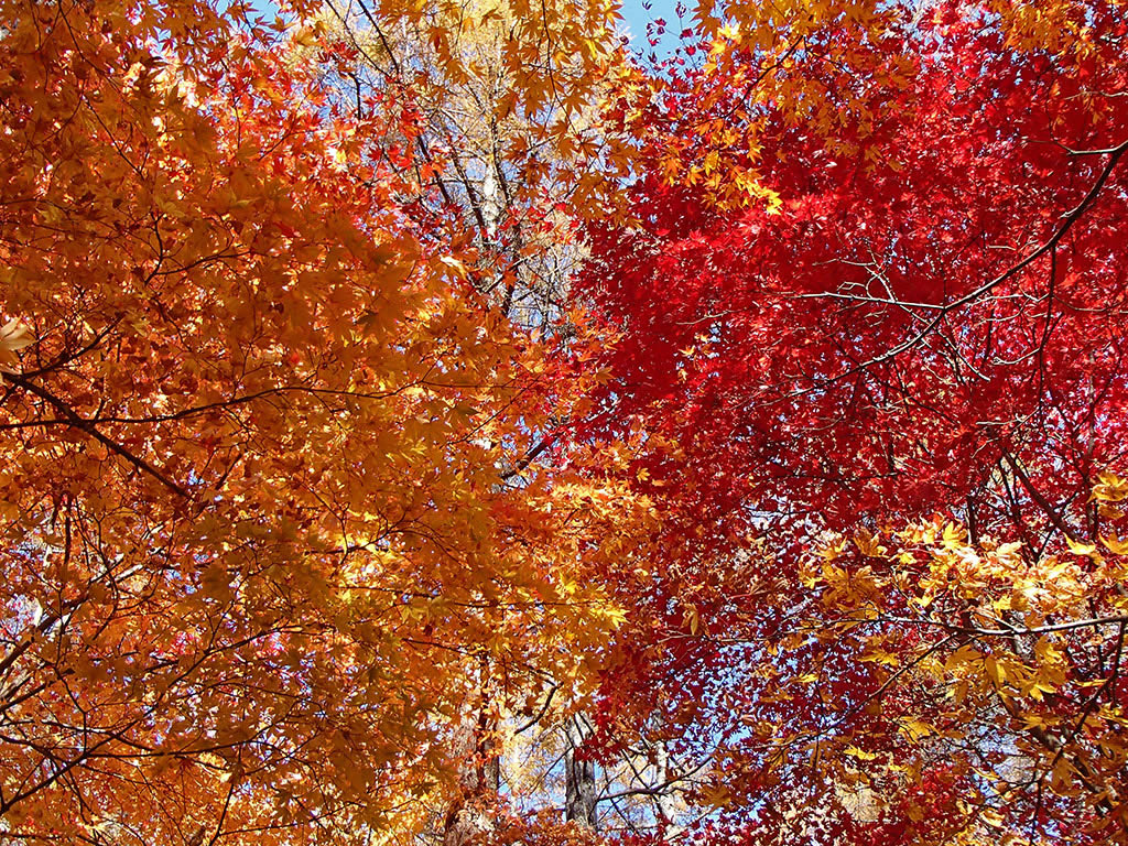 毎年色付くのが遅いこの2本のもみですが、手前は見頃、奥はまだこれから。