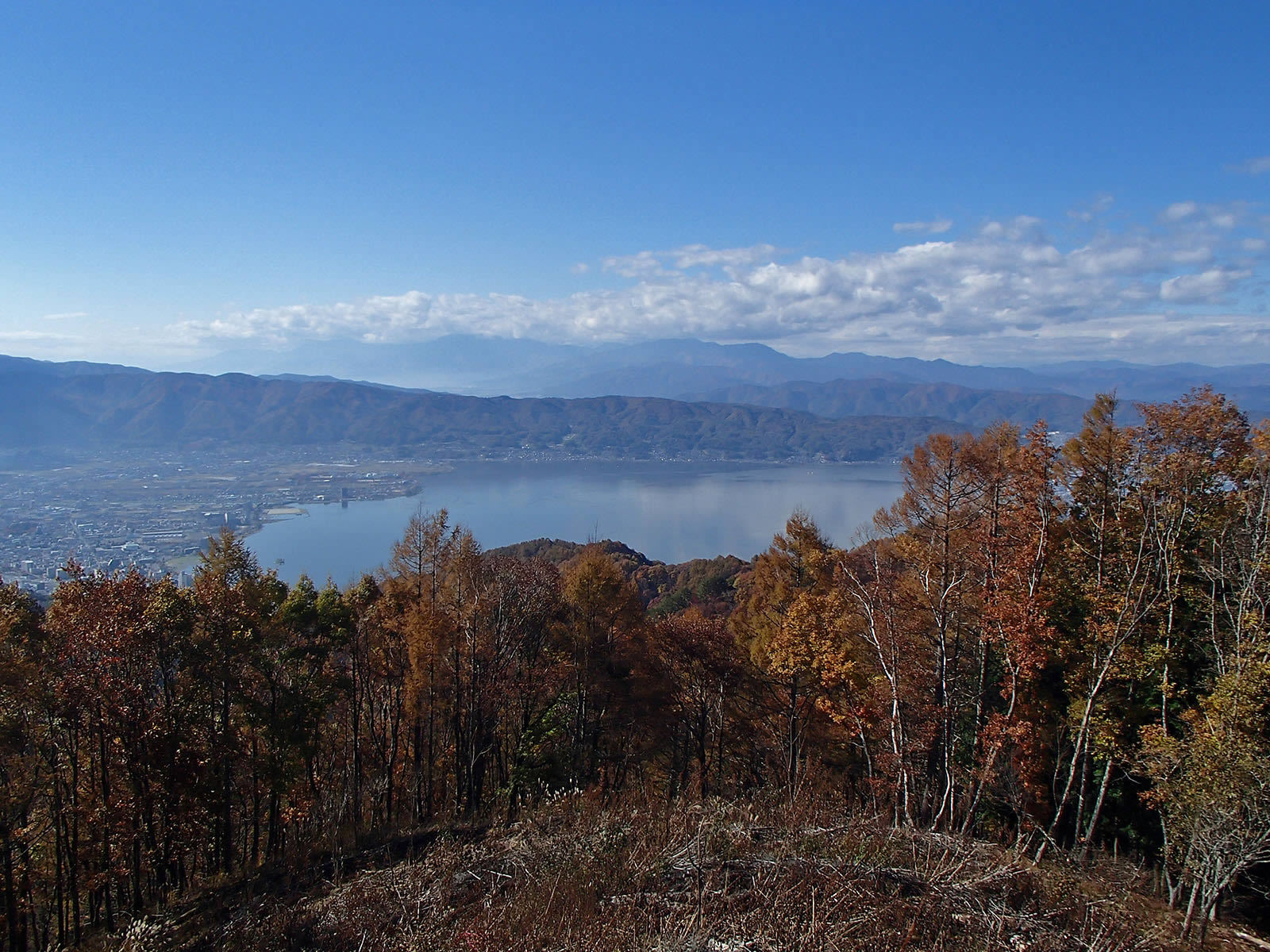 正面に諏訪湖。中央アルプスは稜線に雲がかかっています。