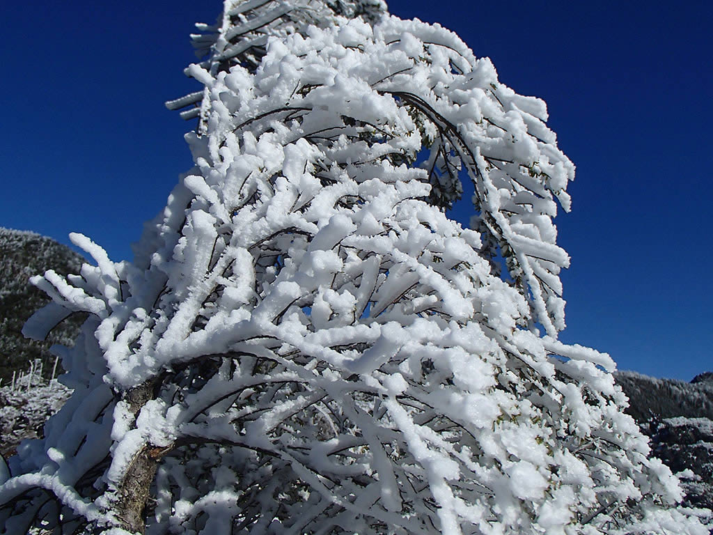 高い枝は霧氷で、下の枝は新雪で真っ白(^^)。