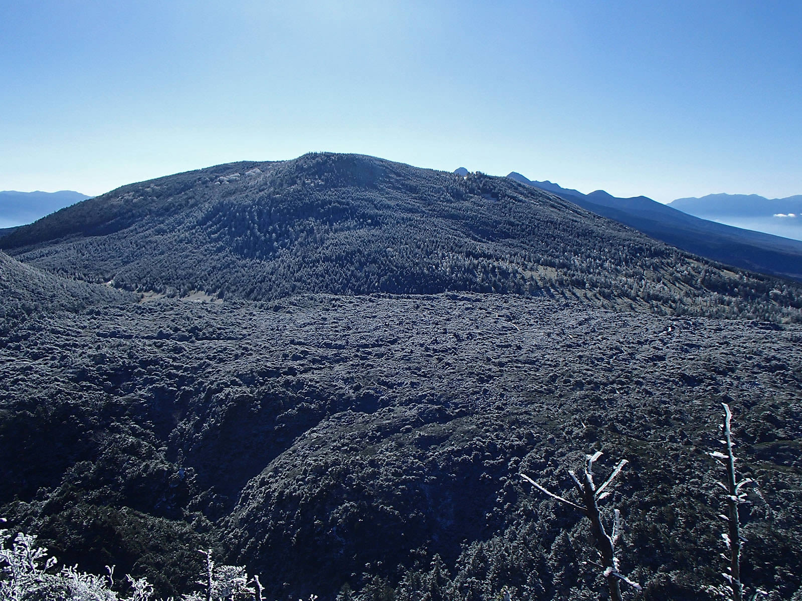 坪庭から上部では霧氷と若干の積雪でプチ冬景色を楽しむことが出来ました。また北横岳山頂ではミニモンスター郡が見事でした(^^)。わずか1時間の歩きでこの風景が楽しめるなんて最高です。