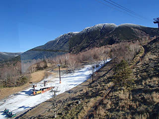 9時の始発のロープウェイで登っていきます。ゲレンデも部分的に白くなっています。