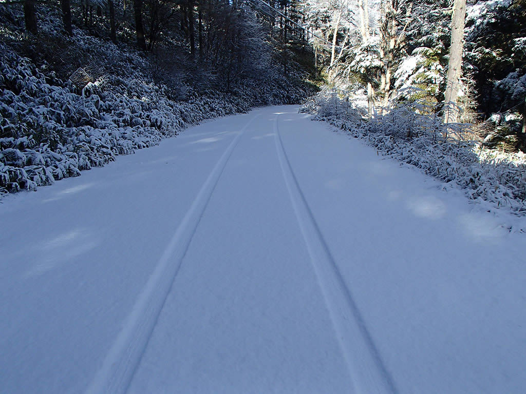 林道は上部は雪道でした。うっすら程度かと思っていたのでびっくり。