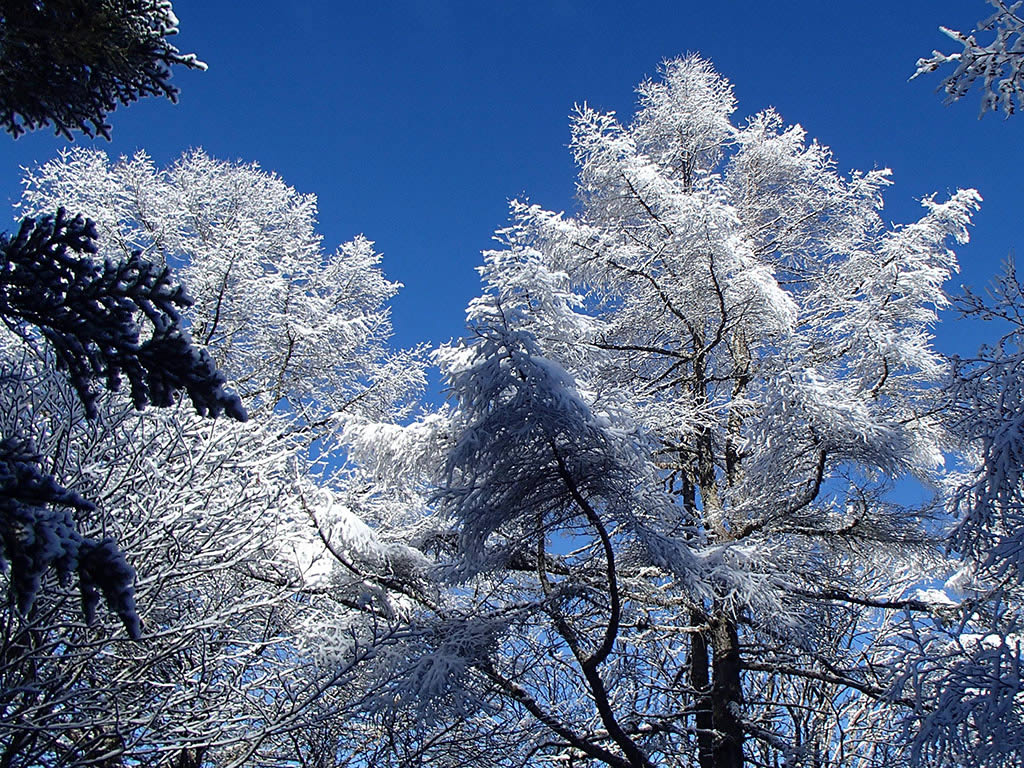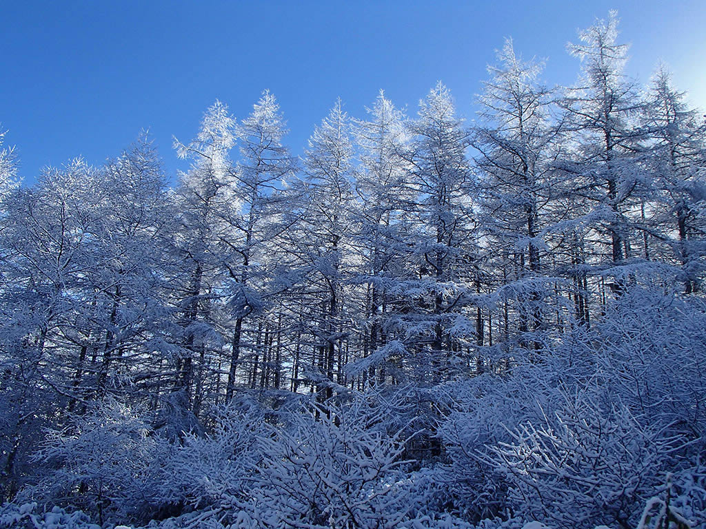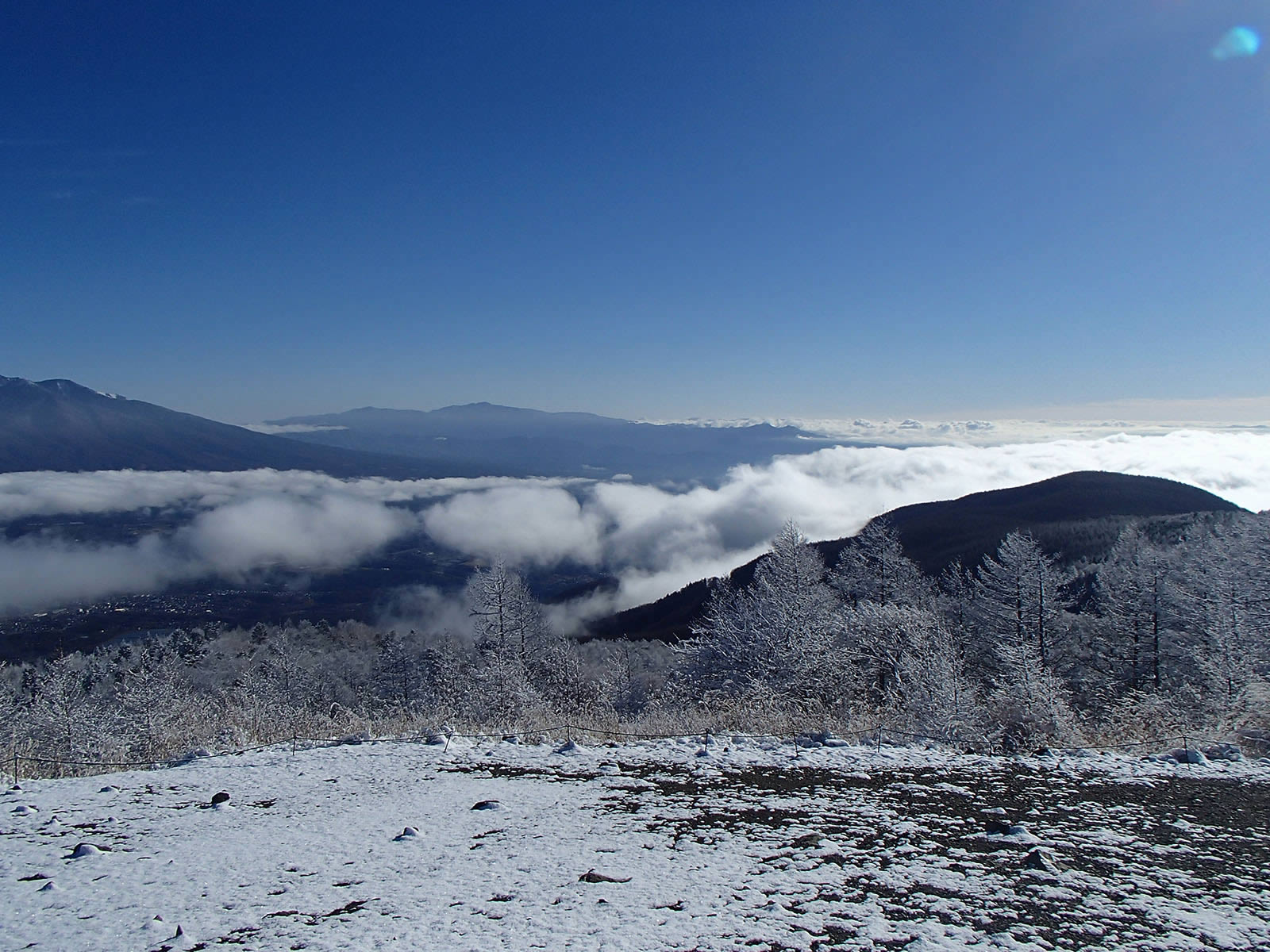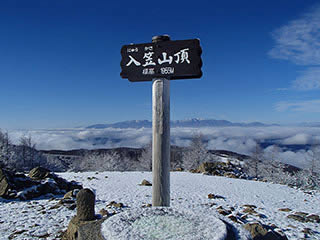 入笠山でもうっすら新雪か霧氷が楽しめるかなと期待していましたが、ところがびっくり、上の方では5cmほどの積雪があって吹き溜まりでは7〜8cmほど。積雪以上に凍結個所がいやらしく、登りの林道が最大の関門となりました(^^;。