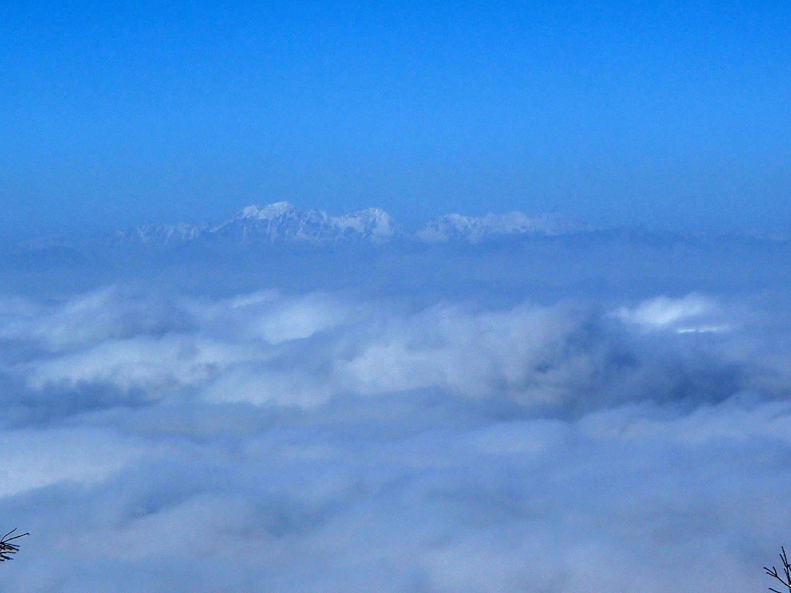 ちらりと乗鞍岳。今回の降雪は南岸低気圧によるものなので、あまり雪は増えていないかな。