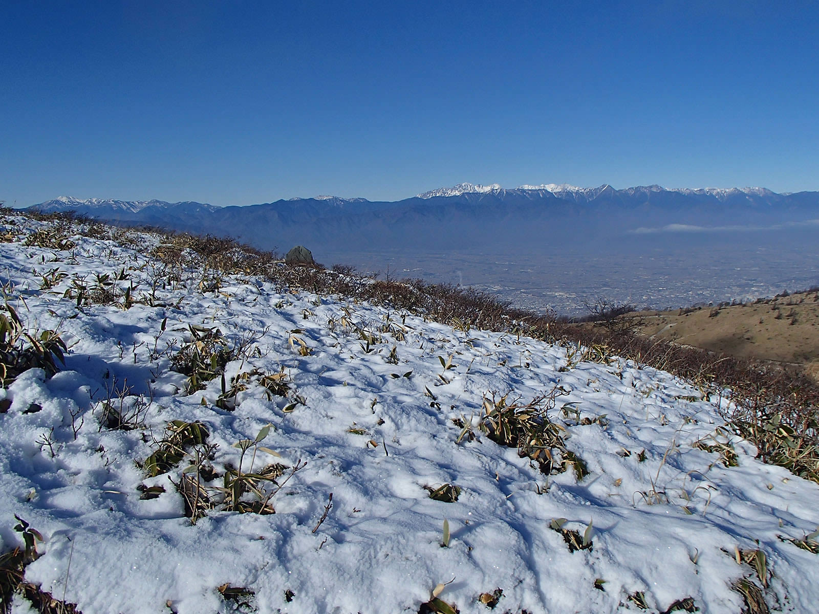 稜線近くは登山道はほぼ真っ白でした。さらさらなので滑り止めは不要でした。