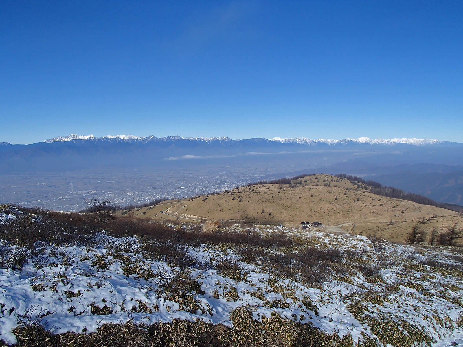 その後高ボッチから崖の湯に林道で下って、牛伏寺から鉢伏山に登ろうかなと計画していましたが、うっかりでしたが崖の湯への林道はすでに冬季閉鎖になっていたため、時間も考えて今回はここから林道を歩いて往復することにしました。