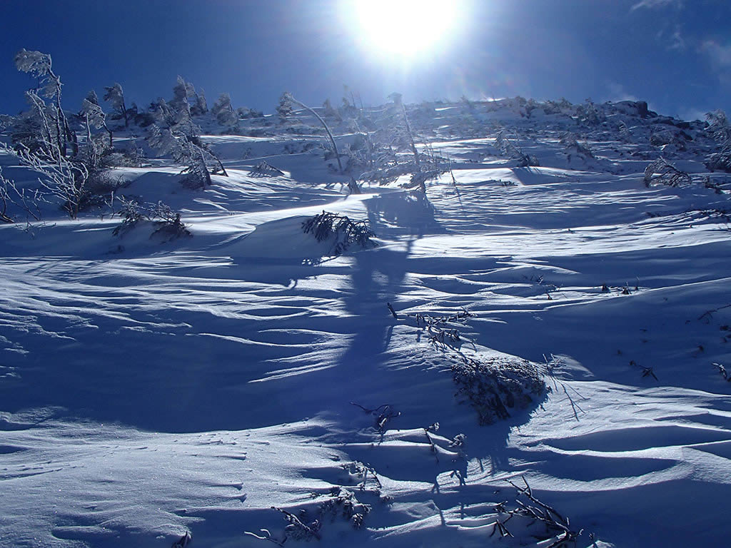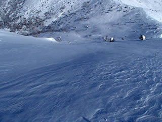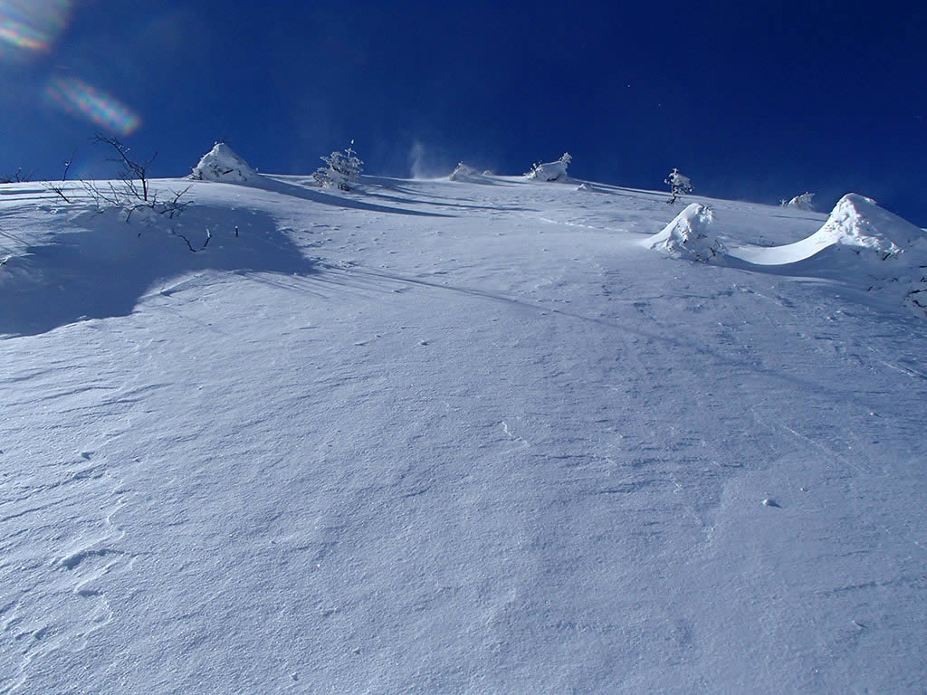 少し登ると新雪がほぼ飛ばされた斜面に出ます。