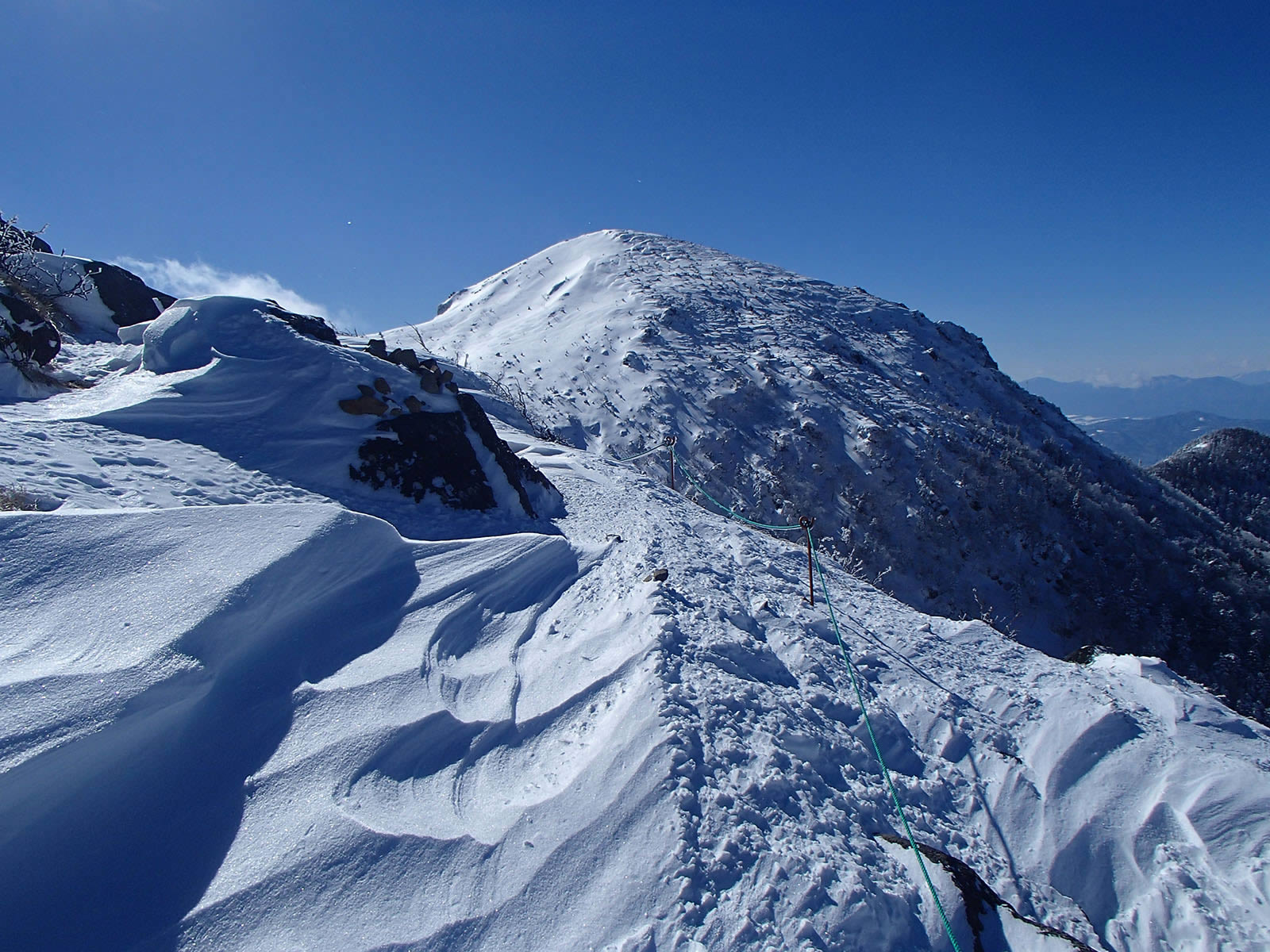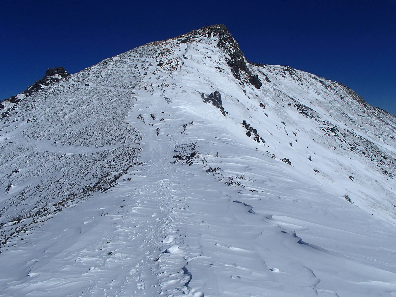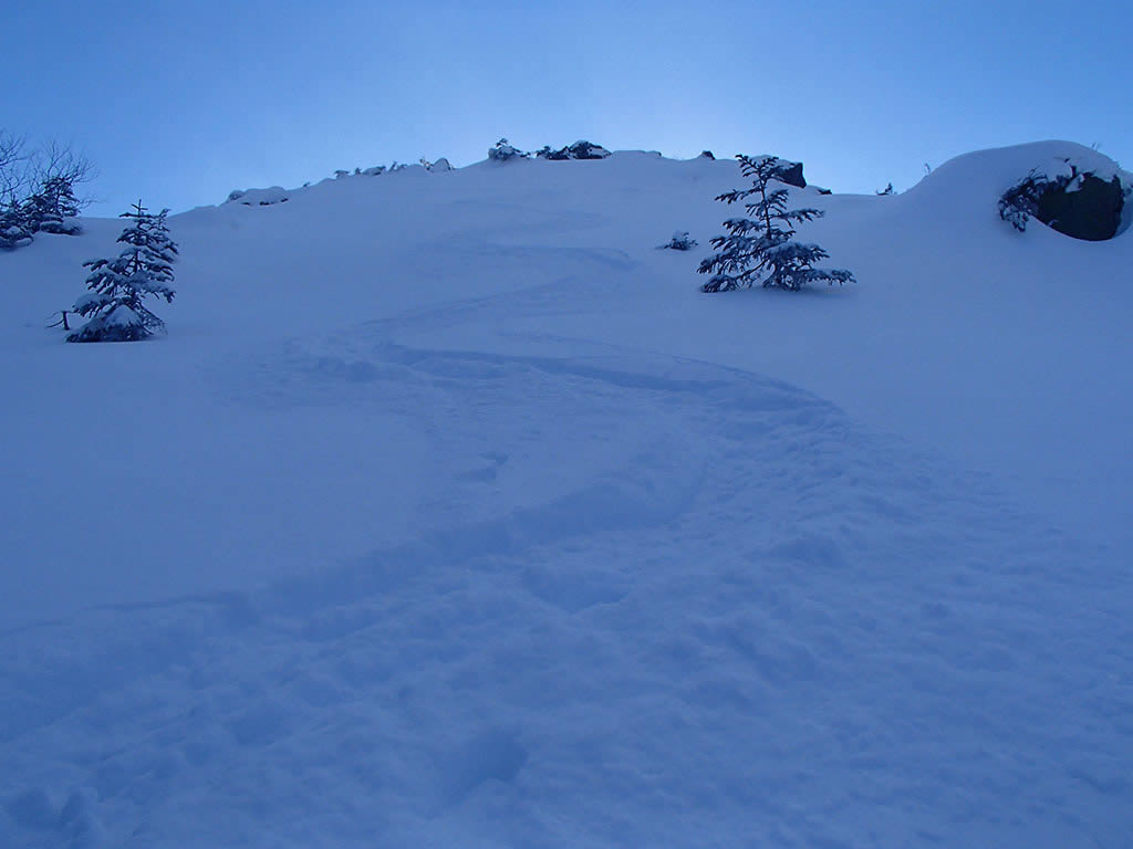 上の写真の吹き溜まりを突破しようとしたら、いきなり隣の斜面が小さく雪崩れました(^^;。山頂を目指しているのは私だけで良かった。