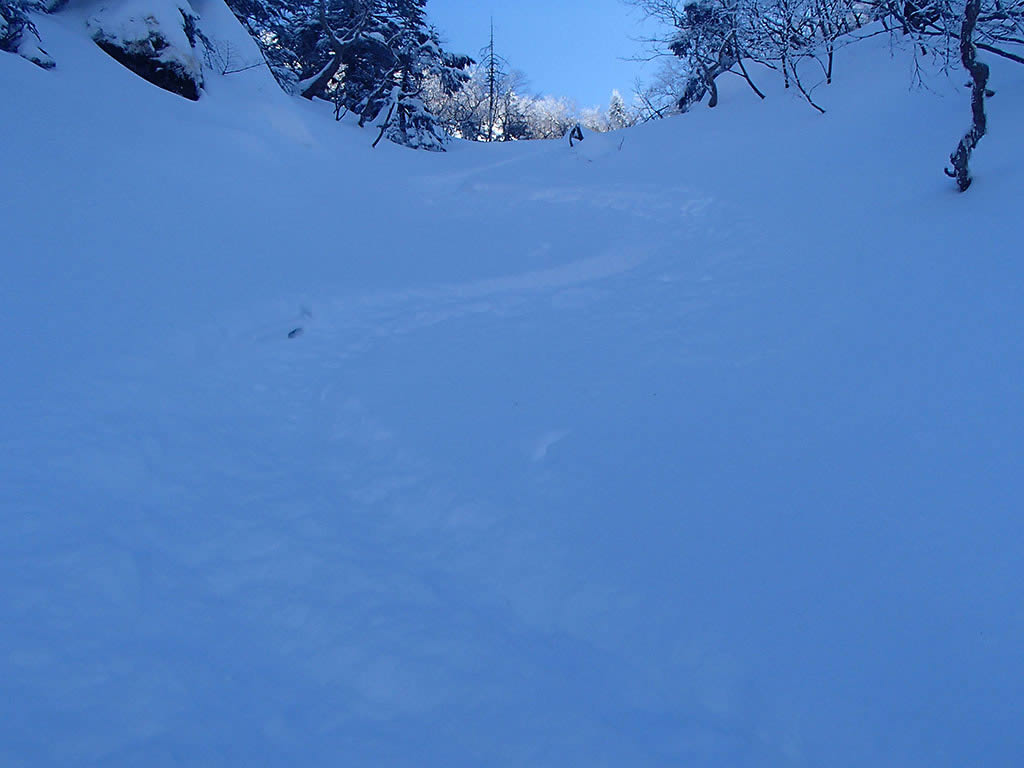 西天狗岳東斜面。なんとか滑れそう。ただ少し風の影響を受けているかな。