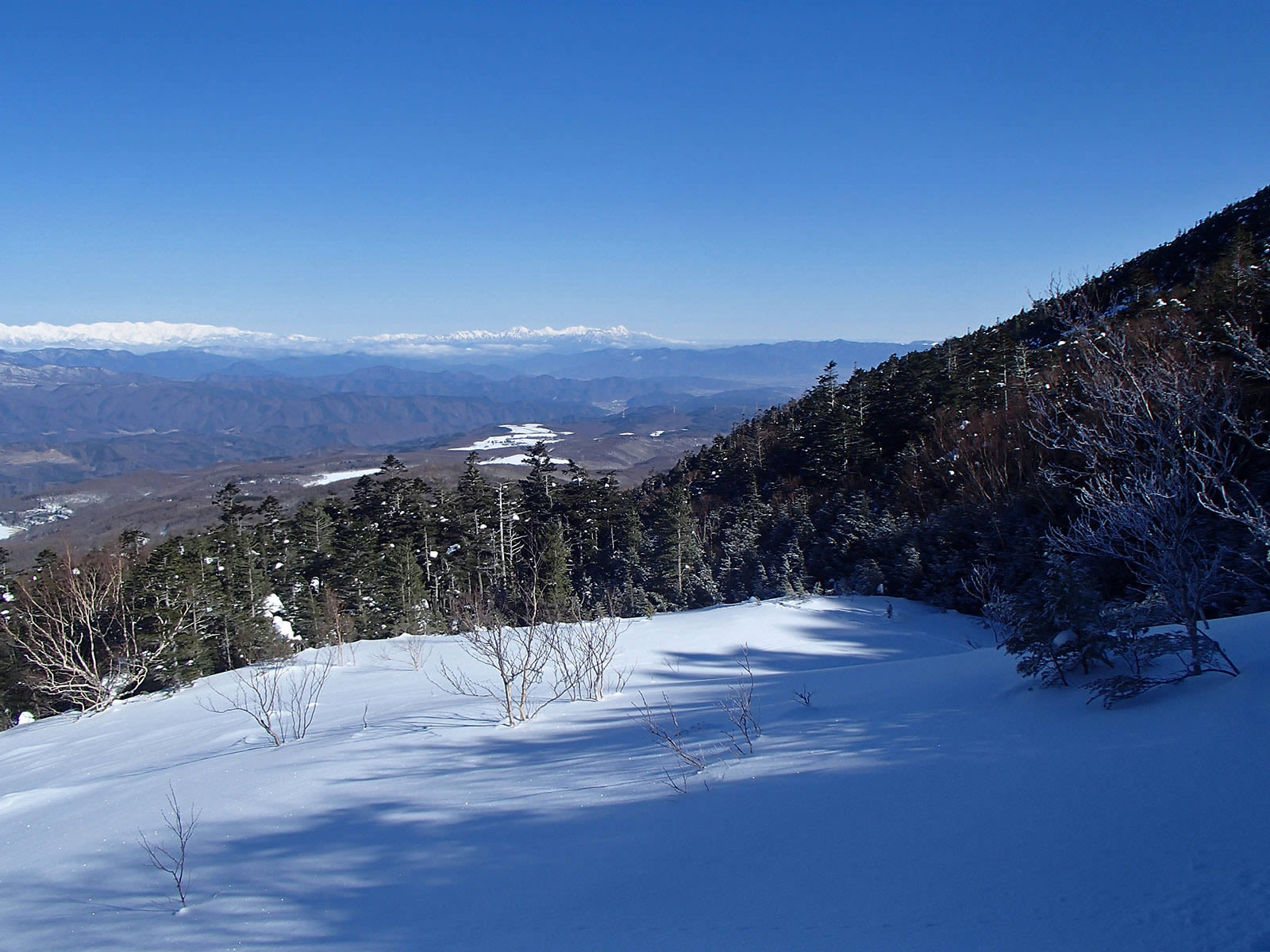 少し登ると斜面の向こうに北アルプスが見えてきました。