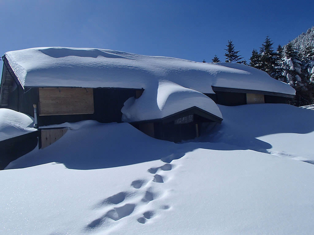 9時14分、将軍平に到着。雪が増えました。あと少しで屋根に届きそう。
