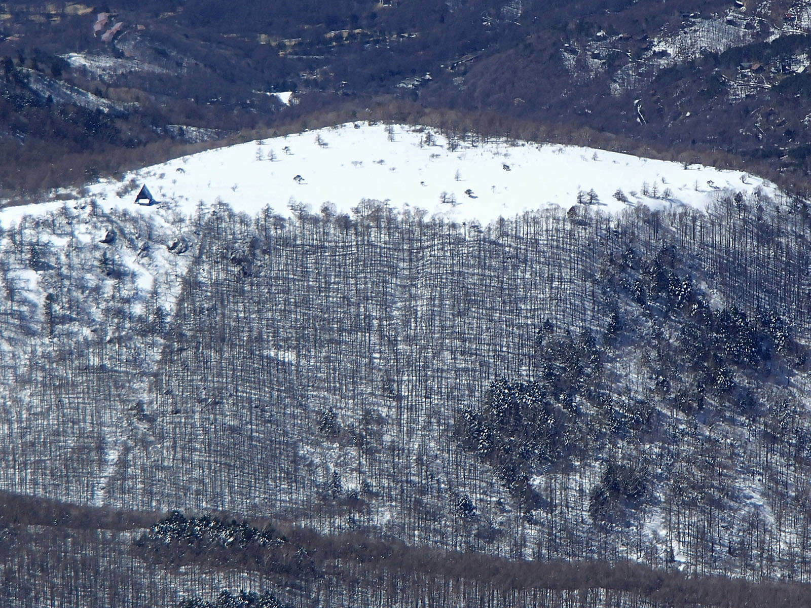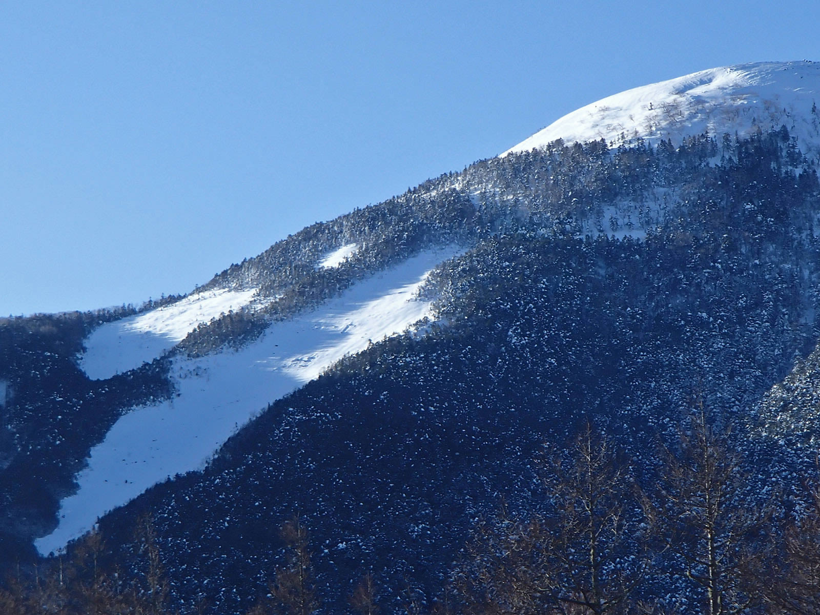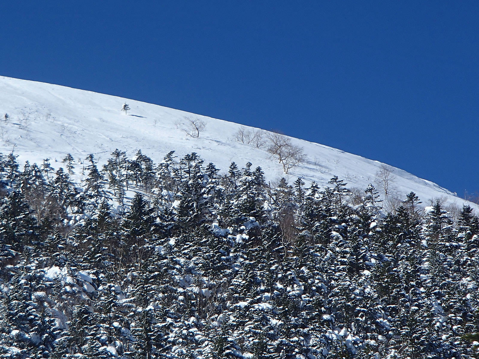 ここから蓼科山北面を振り返ります。あの山頂からここまでスキーで滑り降りてきました(^^)。私のシュプールも少しだけ確認出来ます。