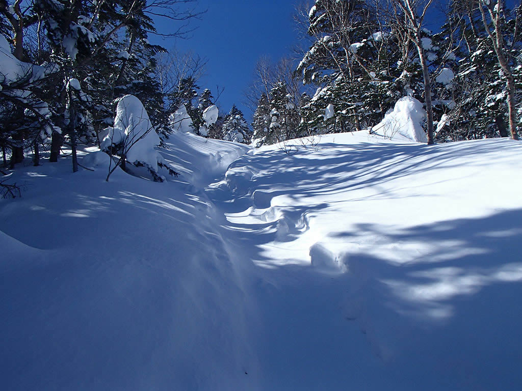 樹林帯はふかふかのパウダーが吹き溜まっています。