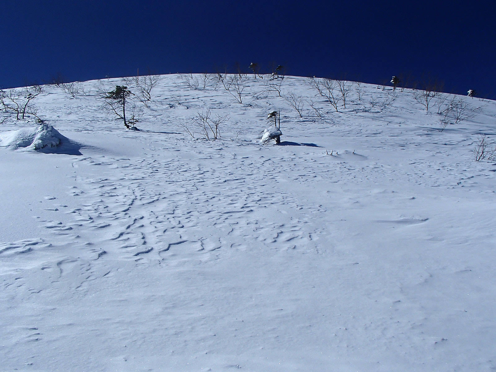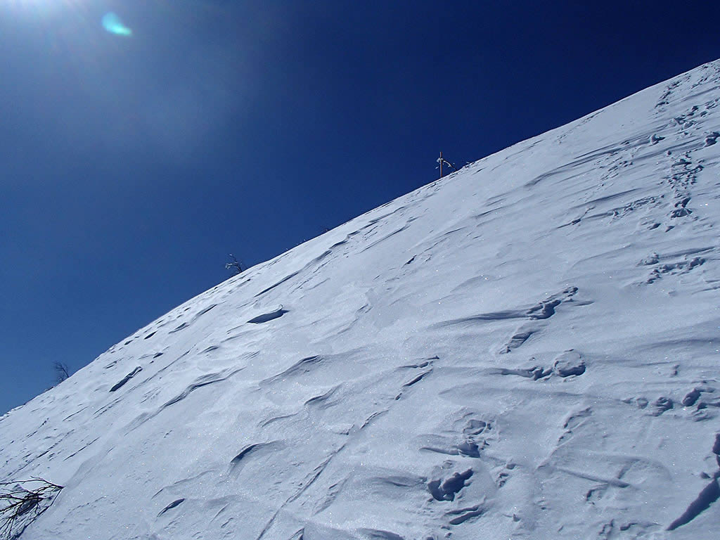 稜線が近づくと風の影響で雪が飛ばされ、雪もパックスノーに。
