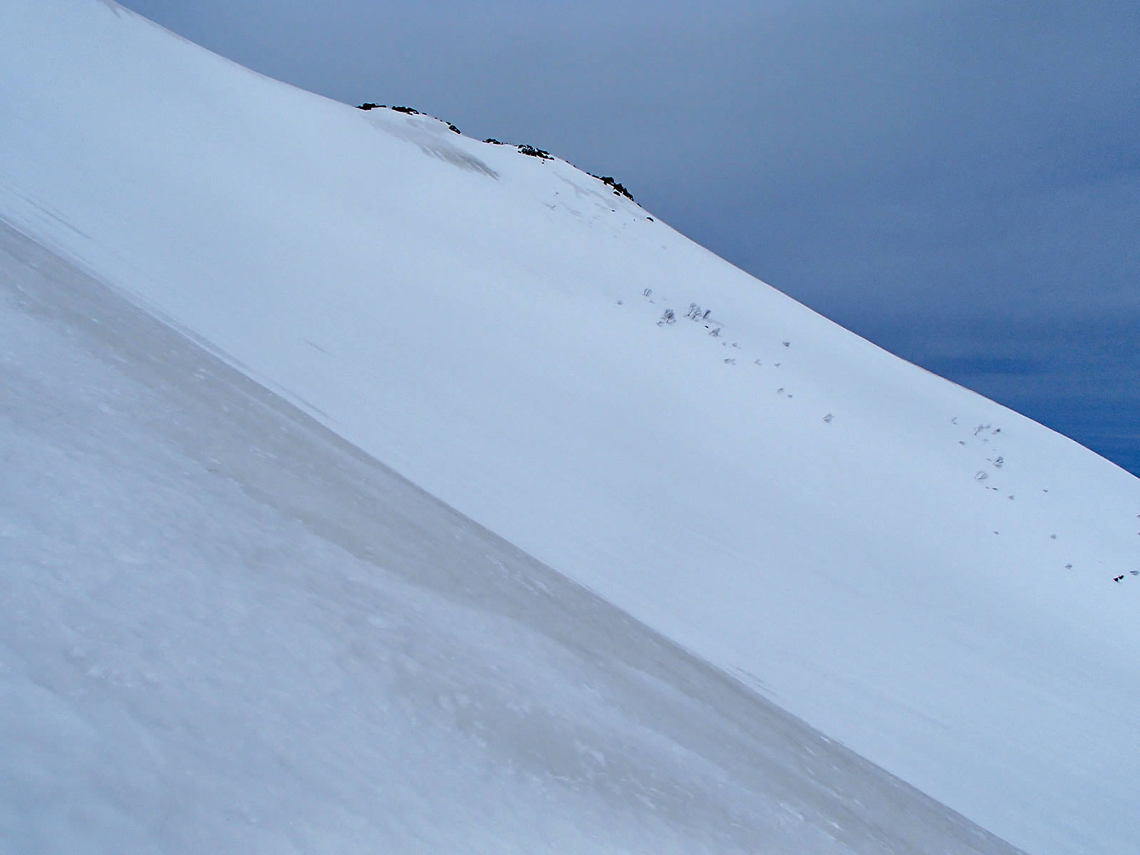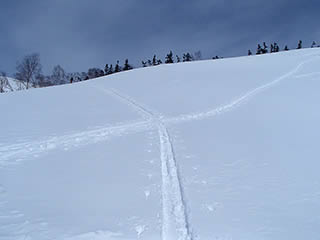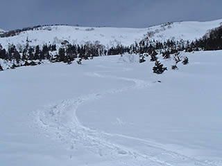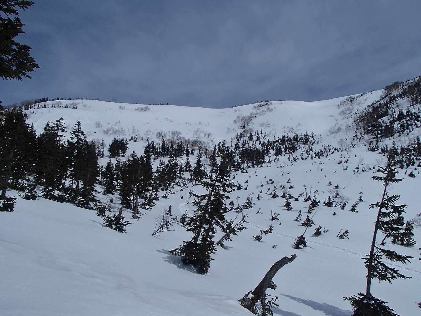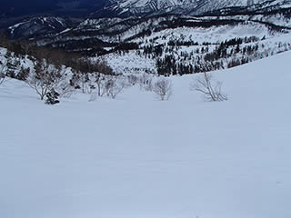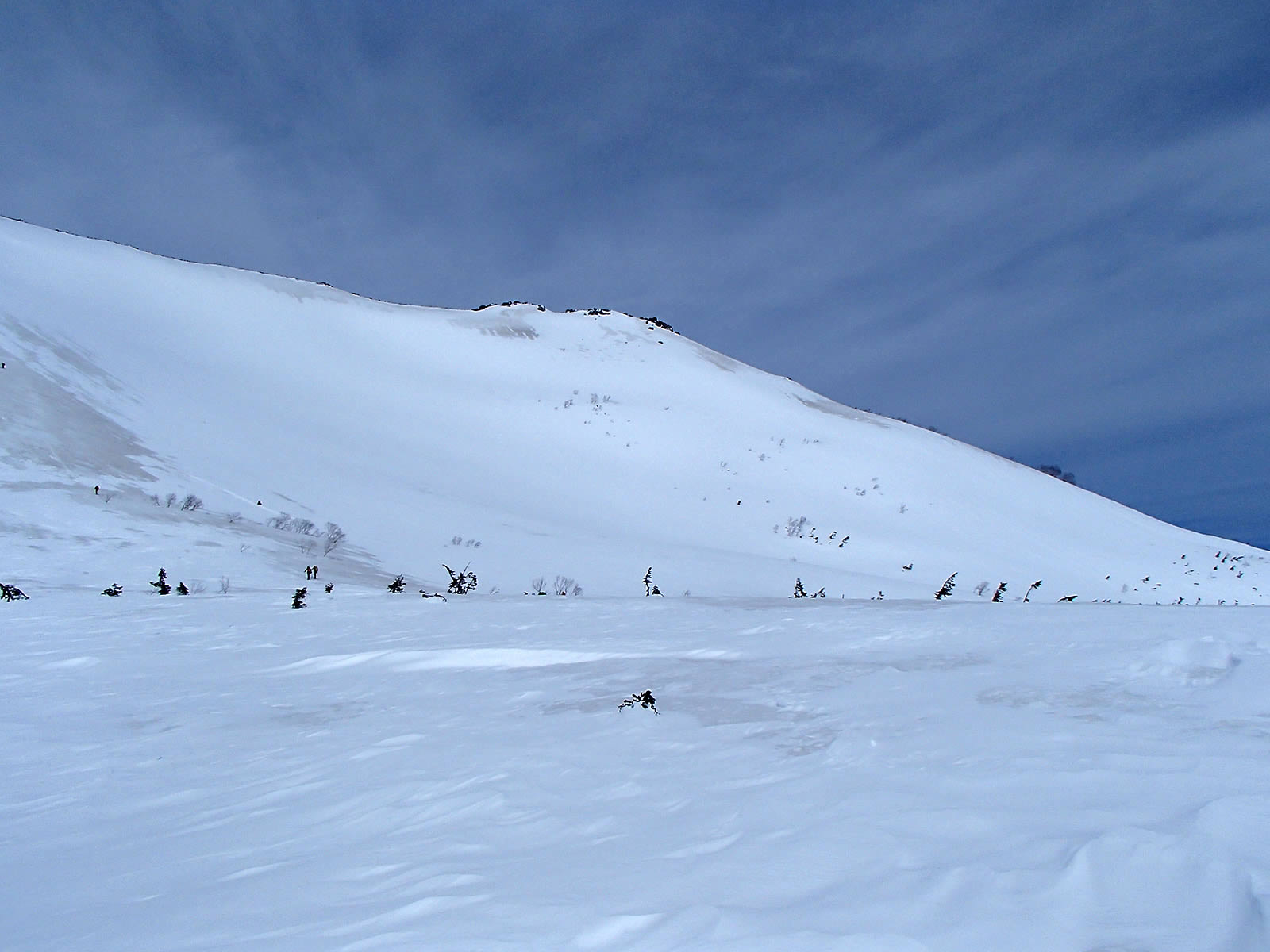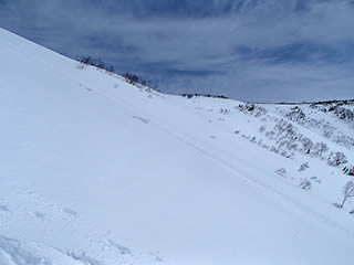 船越の頭の斜面。新雪がたっぷり吹き溜まっているように見えます。