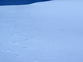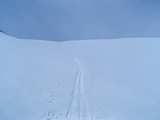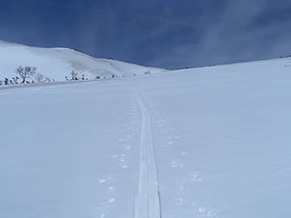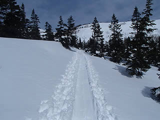 ここから新雪の上を登ります。すでにさらさら感は無く、日差しで少し重くなってきています(^^;。