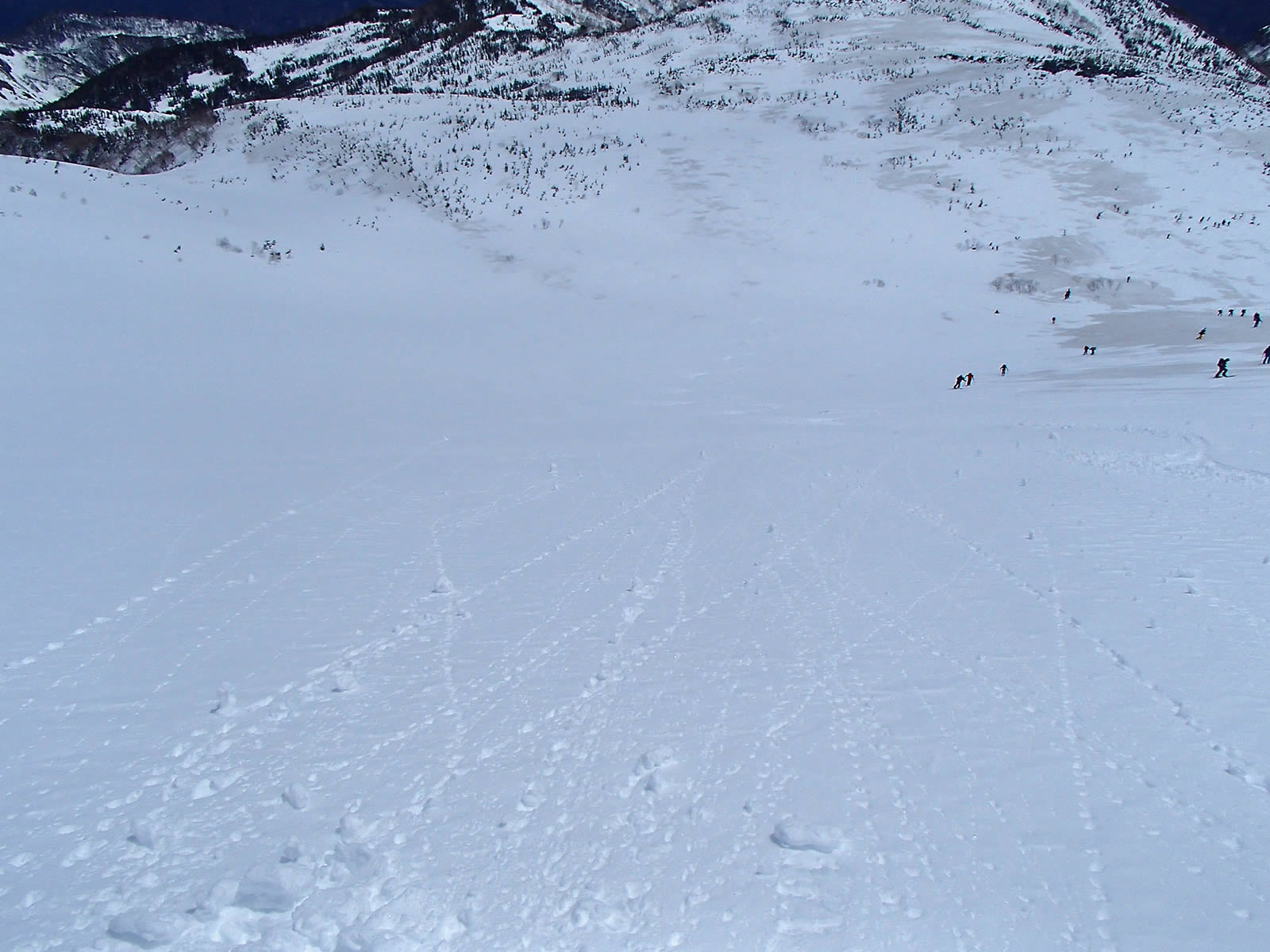 船越の頭の斜面。真っ白です。ただ南面なのであっという間に重くなってしまいそう。