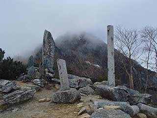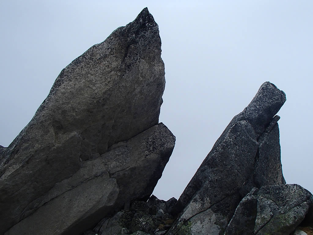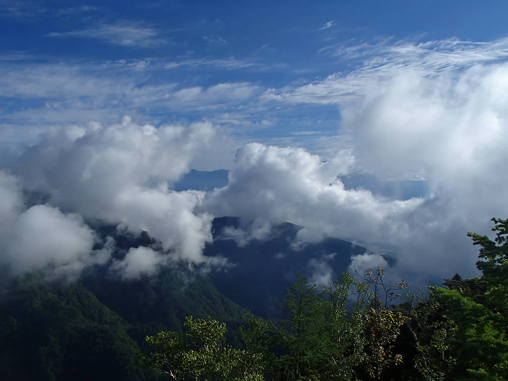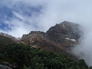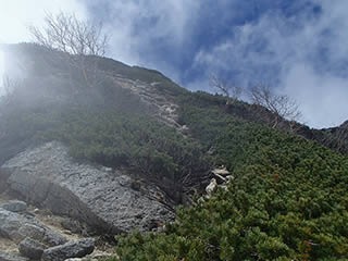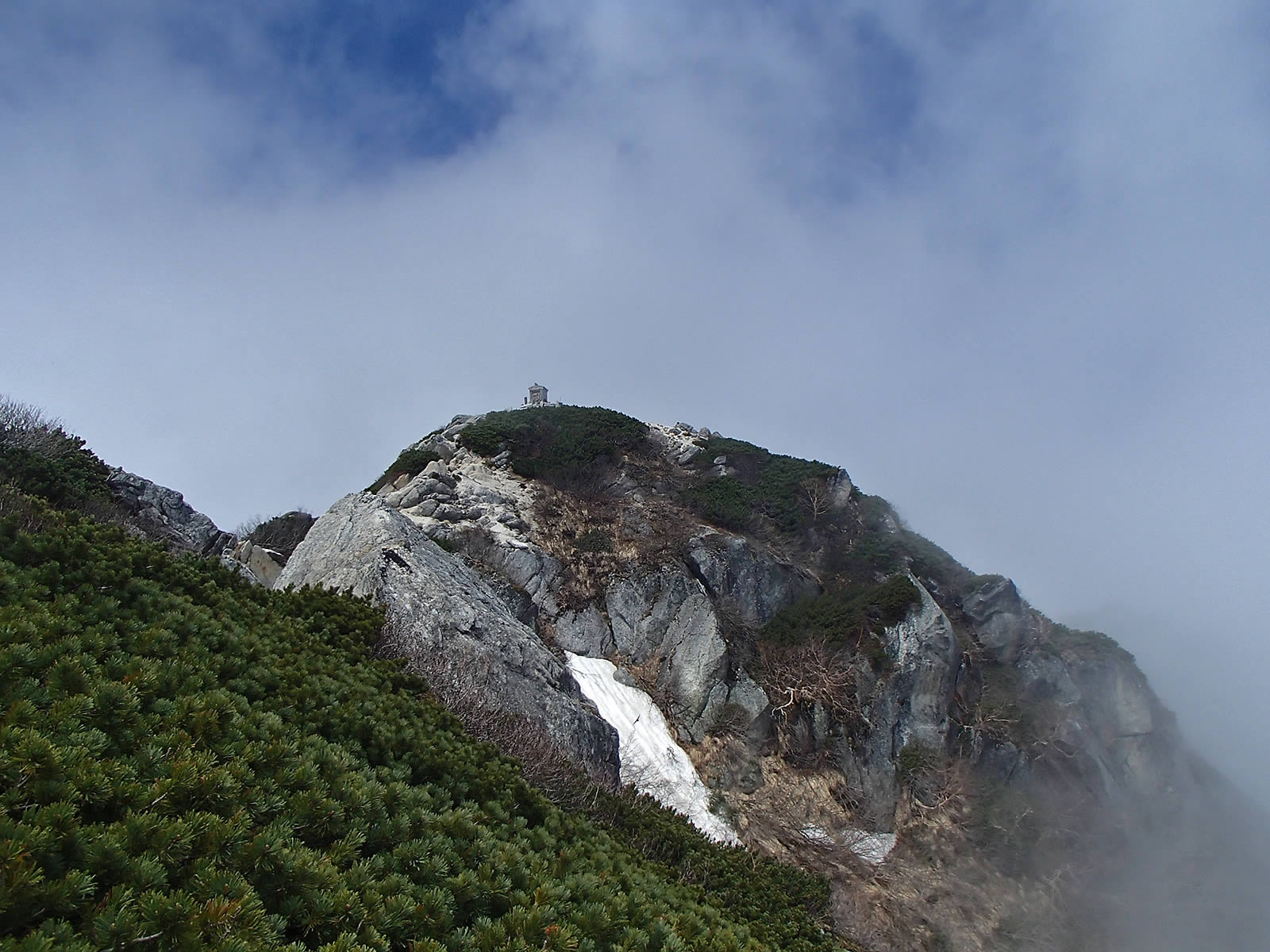 そのうちガスの上に出るだろうと期待していましたが、結局山頂までガスでした(^^;。でも時々青空が見える様になりました。