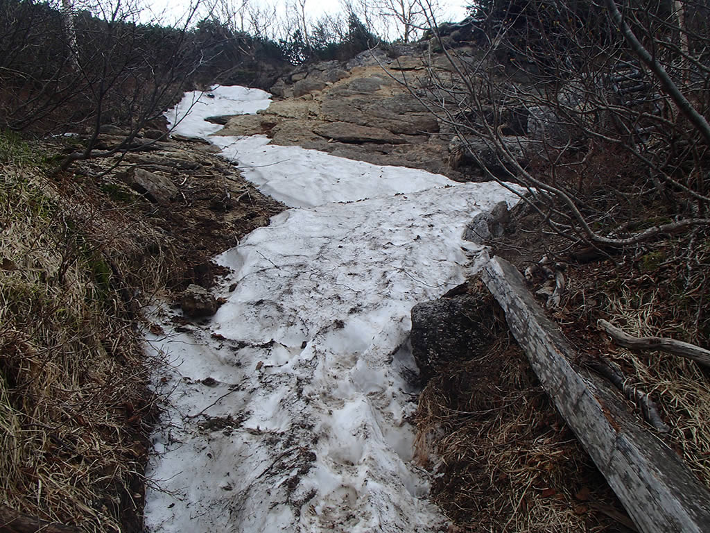 なお登山道の一部に残雪がありますが、雪が緩んでいれば慎重に歩けば滑り止めは無くても何とかなると思います。ただ雪が無くなるまでは簡易アイゼン、チェーンアイゼン等の滑り止めは持参しましょう。