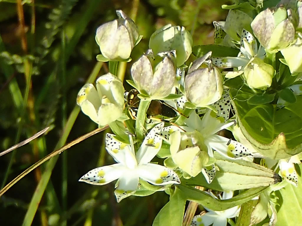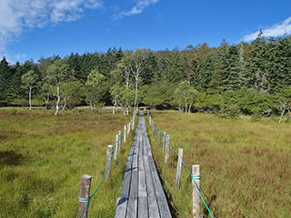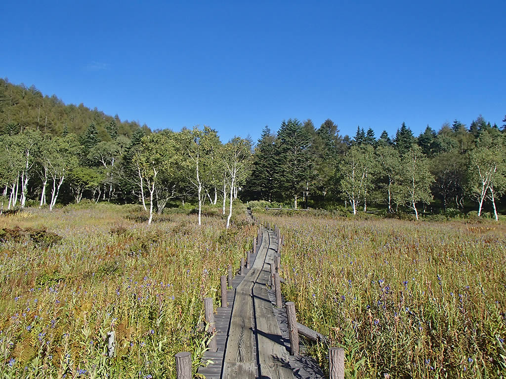 この先、湿原にぽつりぽつりと小さい白い花が咲いていますが、多分みなアケボノソウでしょう。株の上の方はシカに食べられてしまったようで下の方しか残っていないものが多かったです。