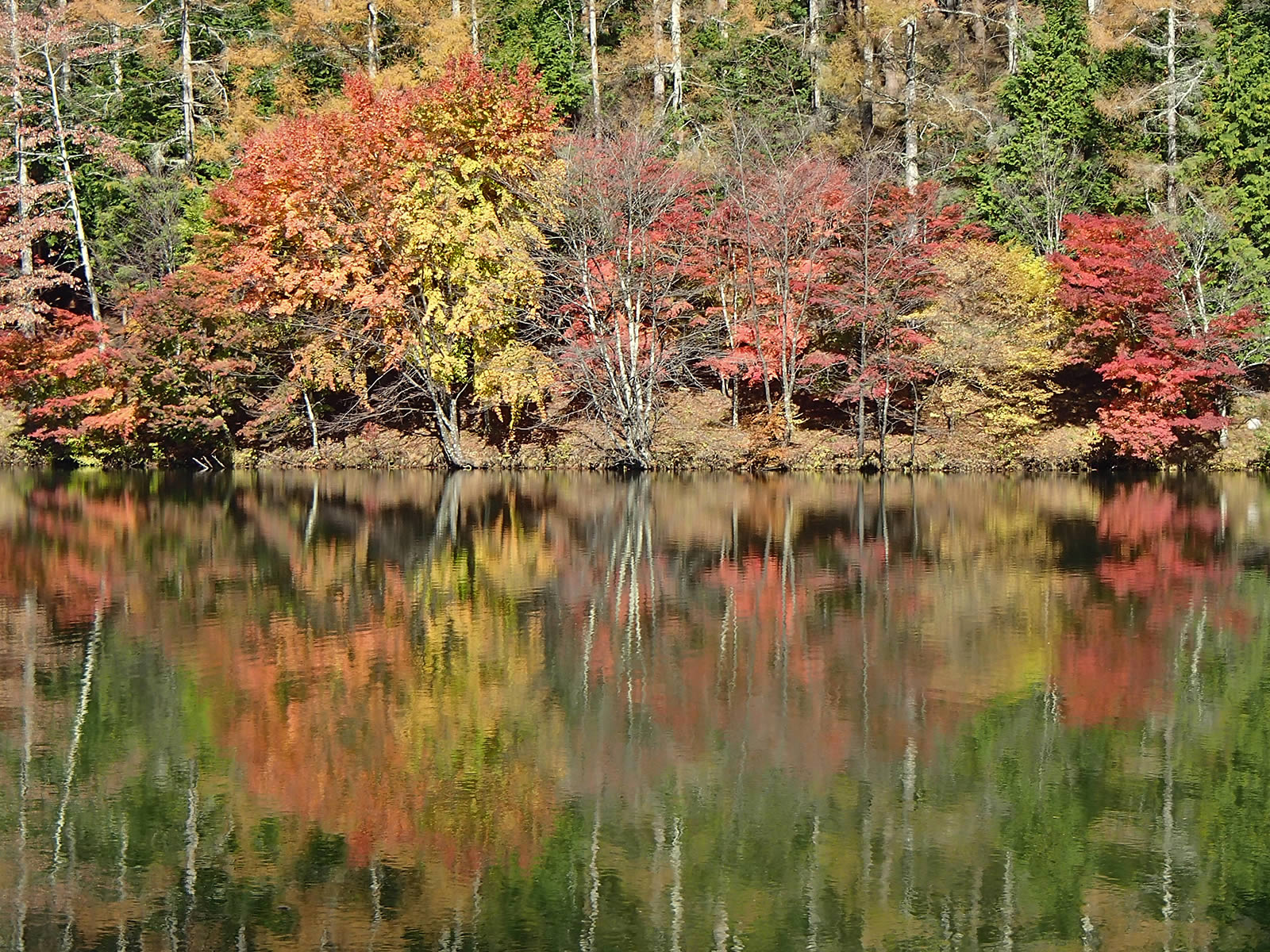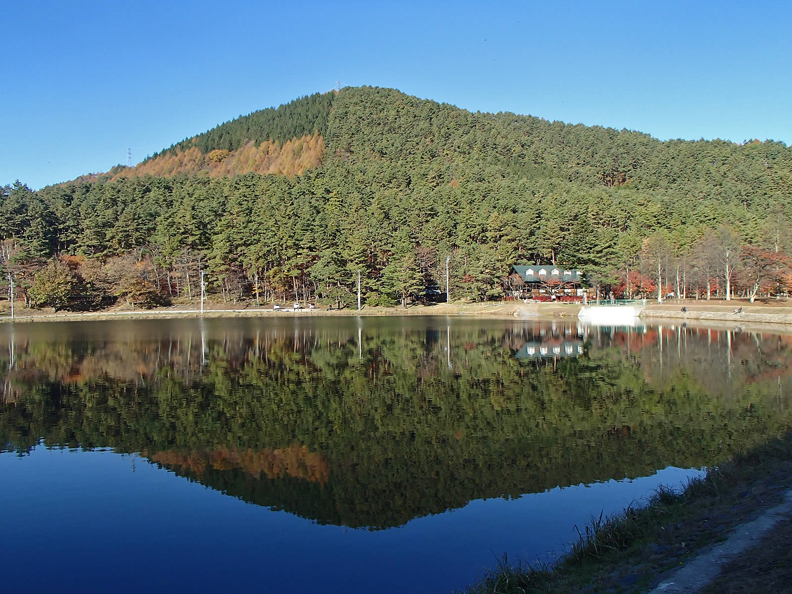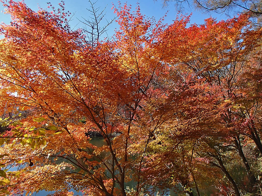 いずみ湖の紅葉はピーク手前ながらちょうど見頃という感じできれいでした。午後ながら風も弱く、水面にまあまあきれいに映り込んでいました。