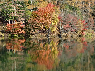湖畔の紅葉はこの辺りはまだ緑も多いです。