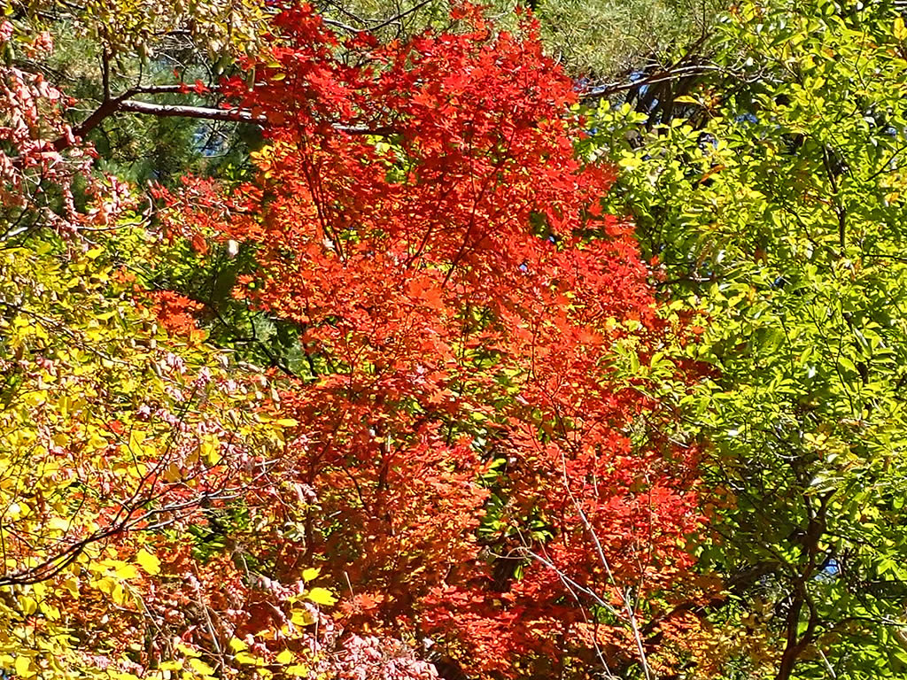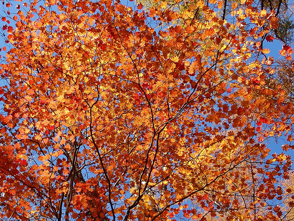 紅葉は登山口の矢立石で色付き始め、そしてすぐに見頃を迎えました。黄色、赤、ダイダイなどカラフルな紅葉をたっぷりと楽しみましたが、やはりさすがの日向山と改めて思いました。