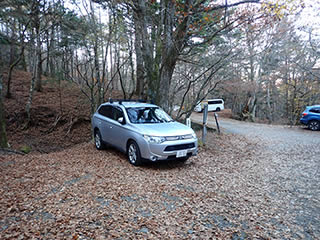 ところで紅葉シーズンの快晴予報の週末、かつ駐車スペースがいつもより少ないと言うことで車があふれていてすれ違いが難しく、この林道の下りのすれ違いが今日一番の難関でした(^^;。