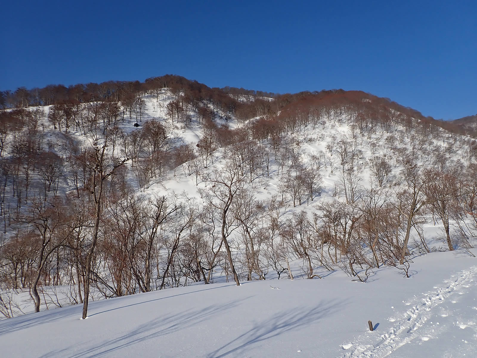 トレースが別れましたので、私は左側手前の尾根を登っていくトレースをたどりました。