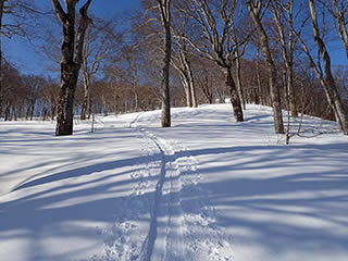 ブナの疎林で滑りやすそう。実際ここを滑っているグループもいました。