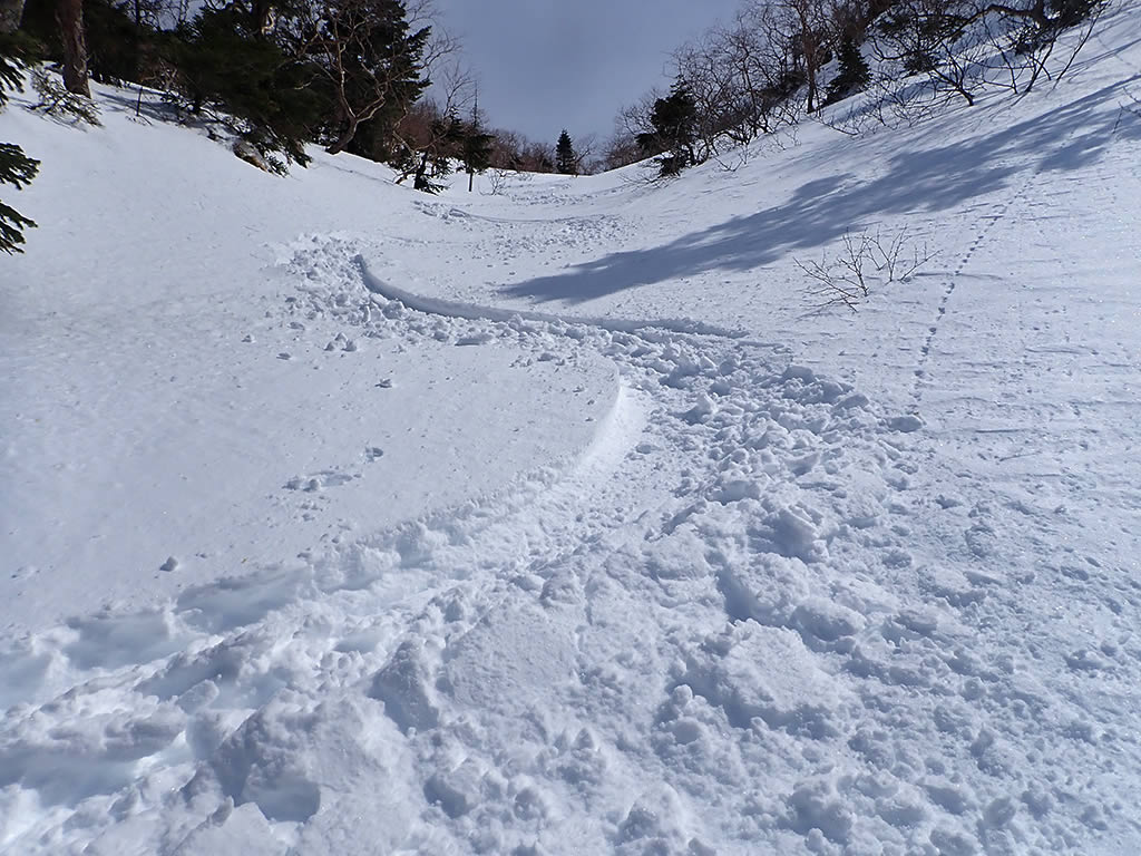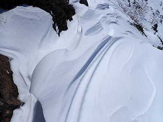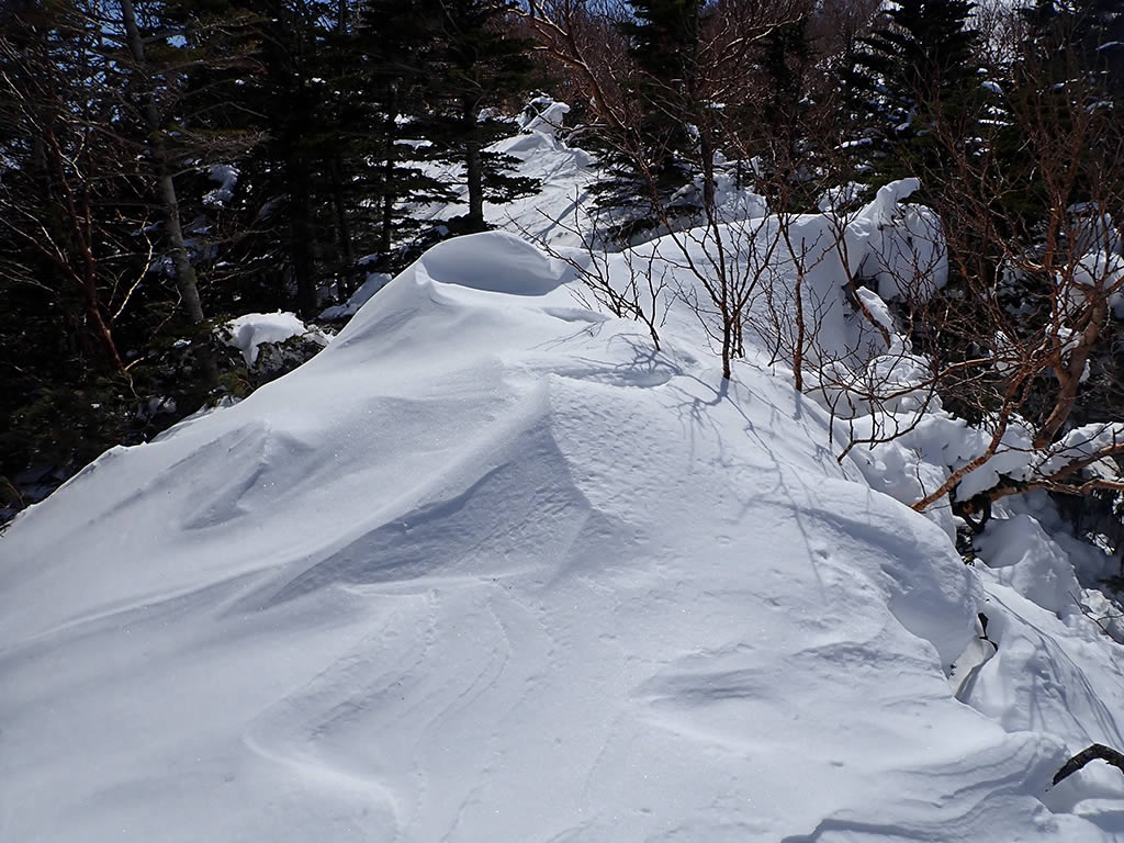 今回やっかいだったのはこの吹き溜まり。足を載せたときは大丈夫かなと思っても体重をかけると30cmほど沈み込みますので、体力を消耗します。