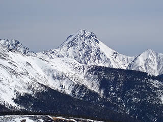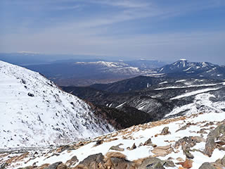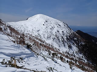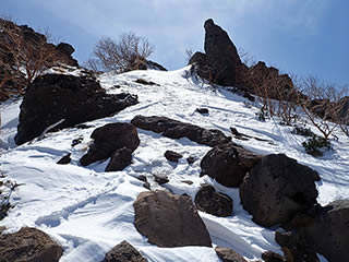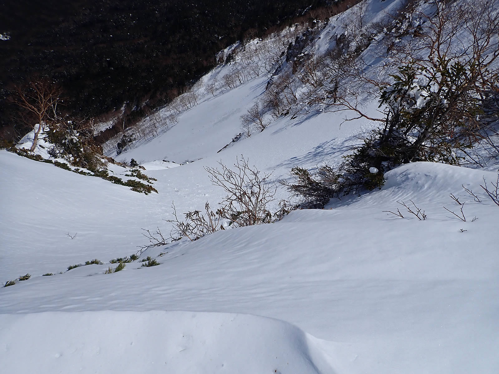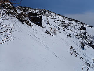西天狗岳東斜面をズーム。うーん(^^;。右側の白いところは吹き溜まりだと期待して向かうことにします。