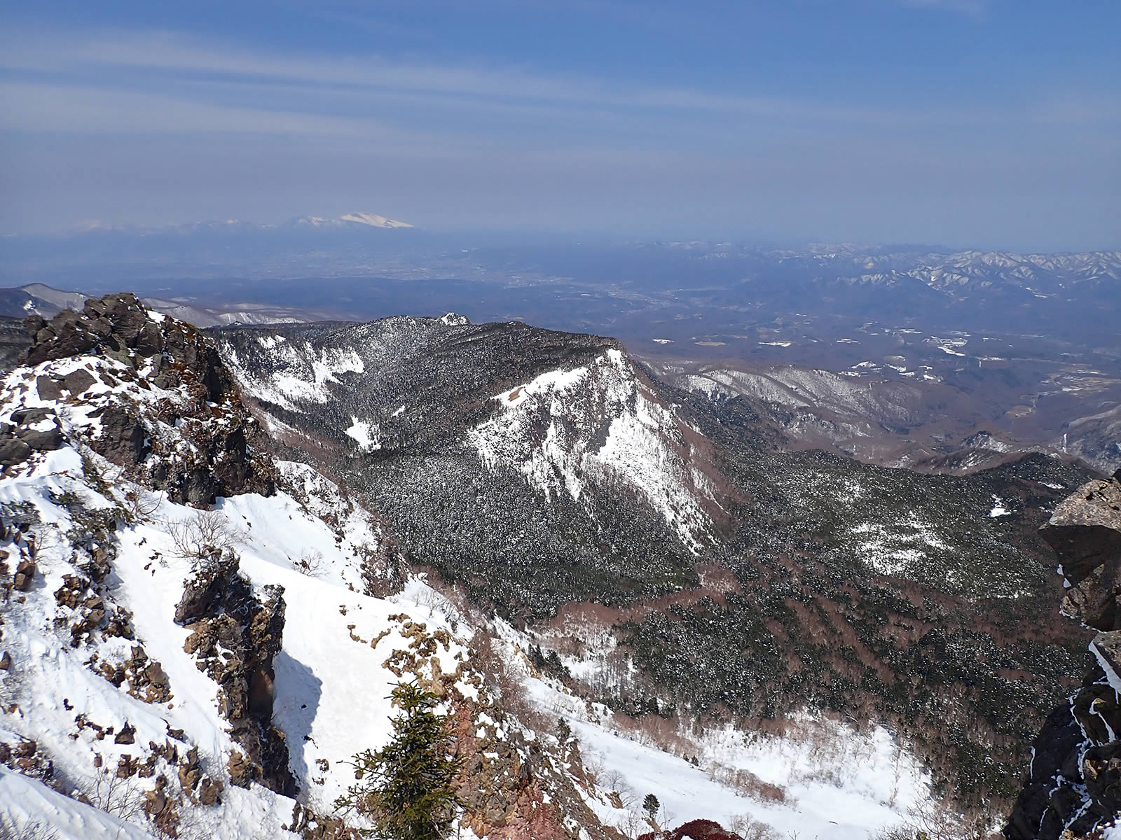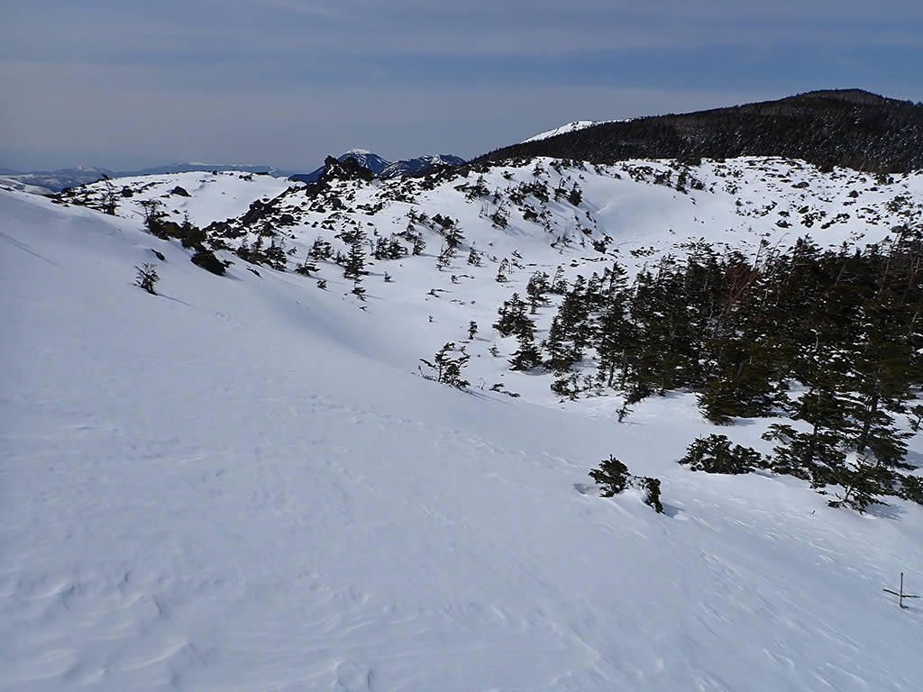 西天狗岳東斜面。新雪がたっぷりと吹き溜まっていることを期待していましたが、昨日の暴風は北風だったということで、どうも状態はあまり良くない感じです。