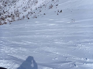 風でハードパックされています。シュプールはなんとか残りますが、あまり快適ではありません(^^;。