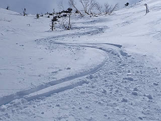 パウダーを期待していましたが実際にはもなか雪(^^;。でも堅めではなかったので、なんとかシュプールを刻むことが出来ました。