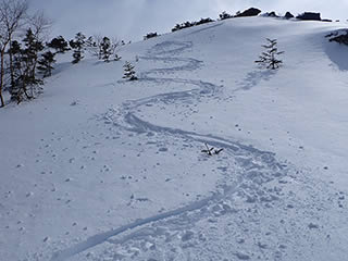 こちらの斜面は日差しの影響で湿雪あるいはプチモナカが多かったですが、ここは柔らかい雪のままでした。なんて気持ち良いんでしょう(^^)。