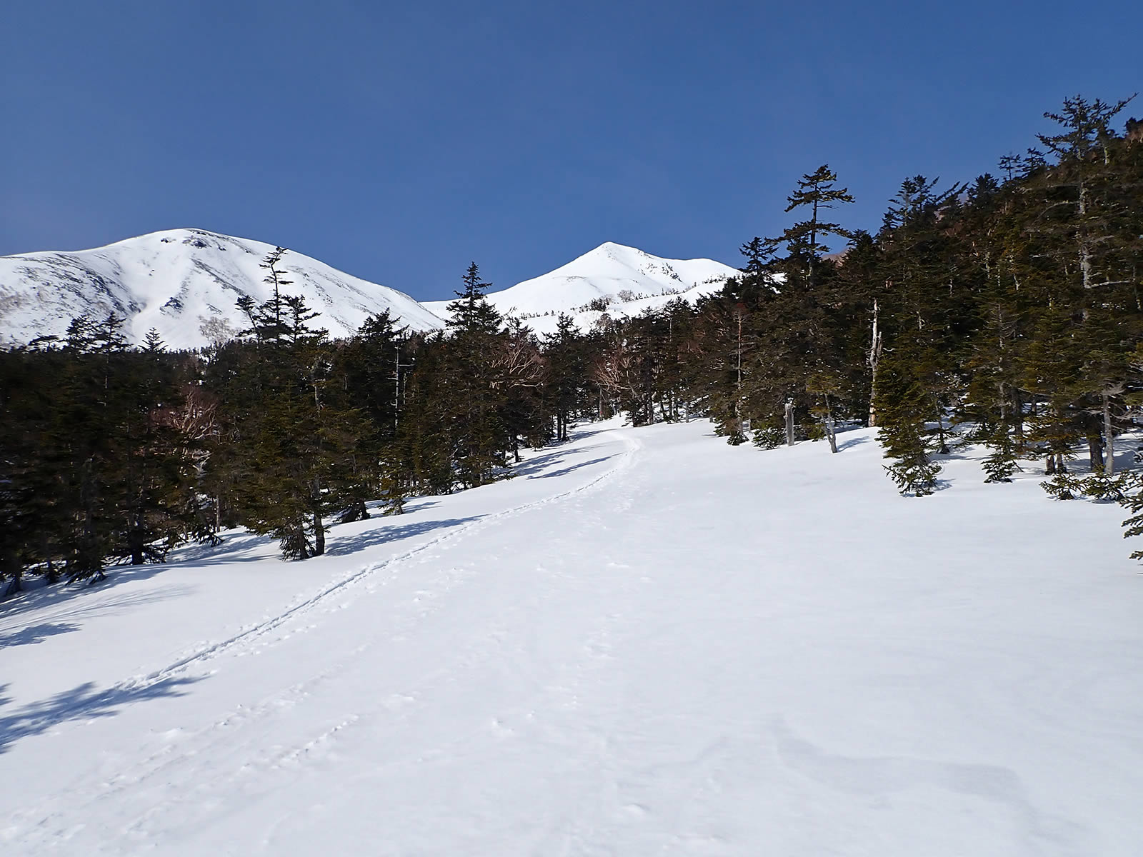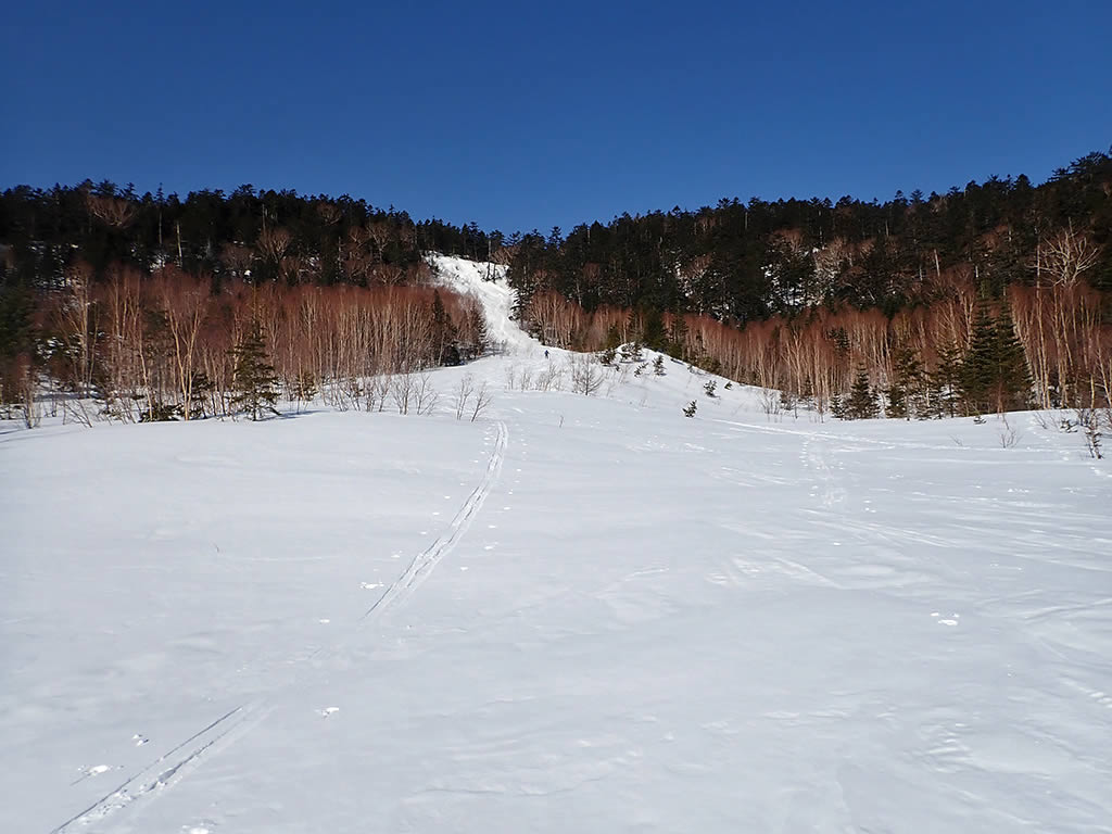 先行しているスキーヤーは皆、肩の小屋経由で朝日岳の方に向かっているようですので、私はノートラックを求めてまだ誰も向かっていない滑り台へ。