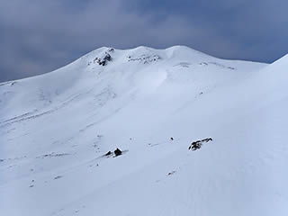 おっ、ちょうど今、朝日岳の吹き溜まりを一人のスキーヤーが滑り降りていきました。