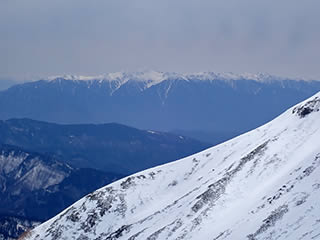 富士見岳、北アルプス。富士見沢も候補でしたが、ここから見える斜面は風の影響で風紋が見えましたので、今回も滑り台をそのまま滑ることにしました。