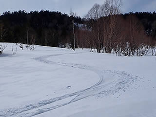 ただ天気が全く期待外れで、位ヶ原に着いた頃から薄雲が広がってきて、滑っているときはほぼ曇りだったのにはがっかり。ただ車で帰り始めて振り向くと乗鞍がきれいに晴れていましたので、午後は徐々に回復したようです(^^;。