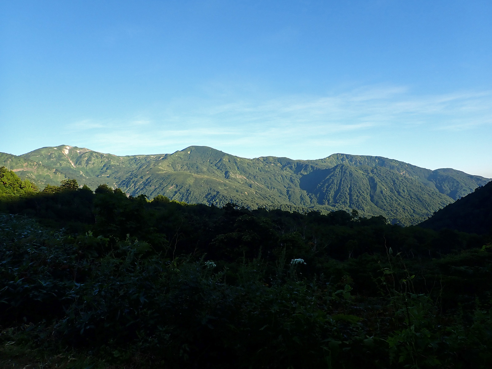 5時55分、蓮華温泉手前の駐車場に到着。駐車場には思った以上に車が駐まっていてびっくり。正面は雪倉岳かな。