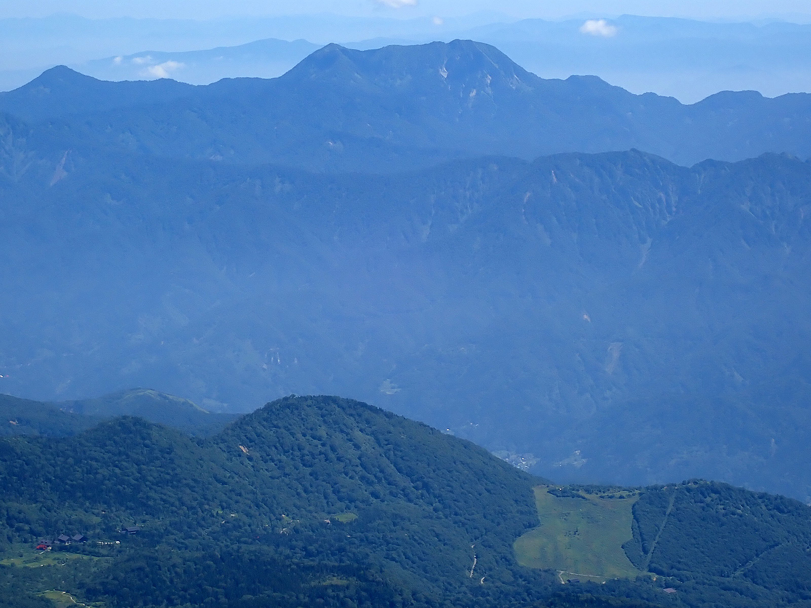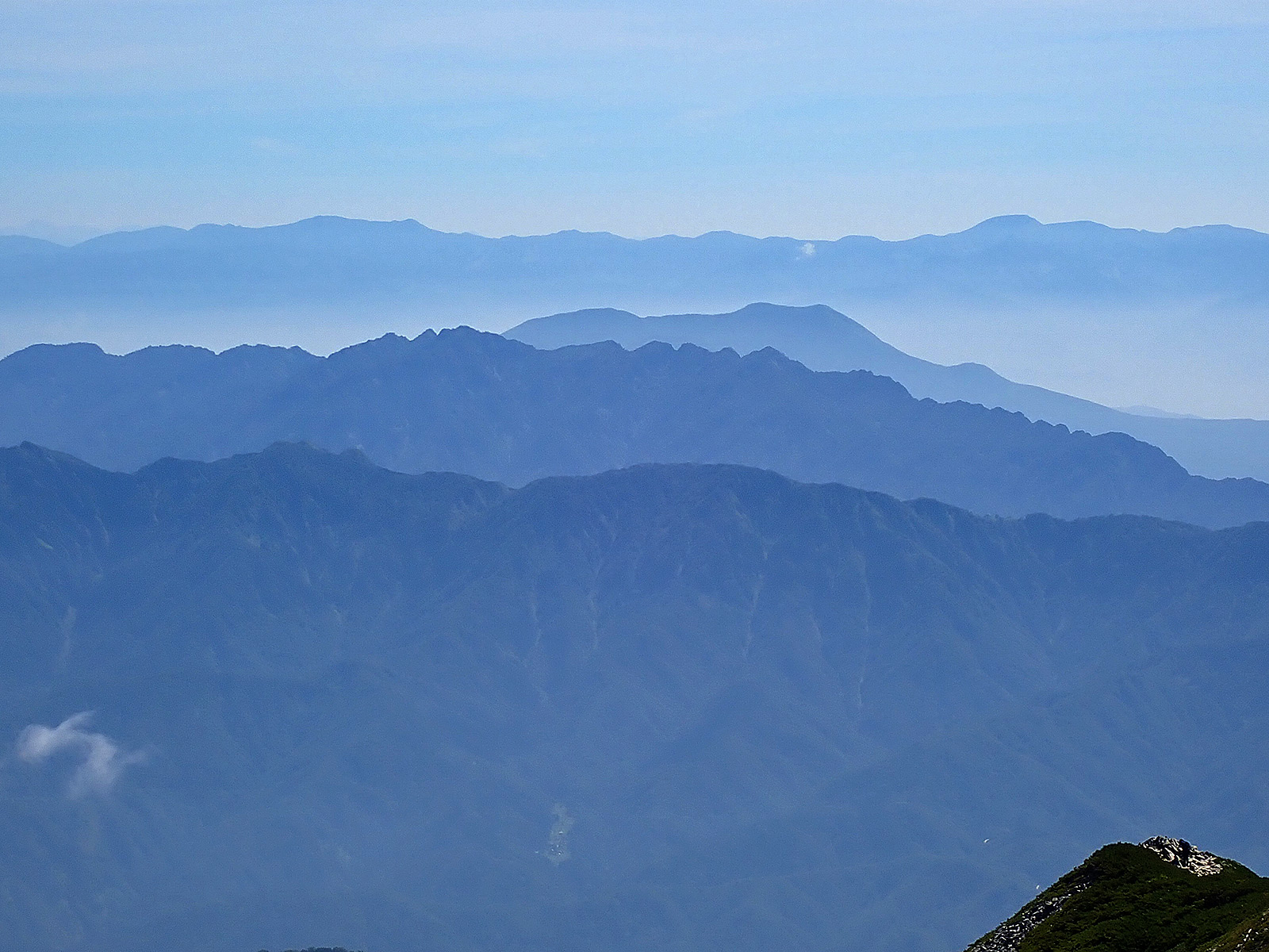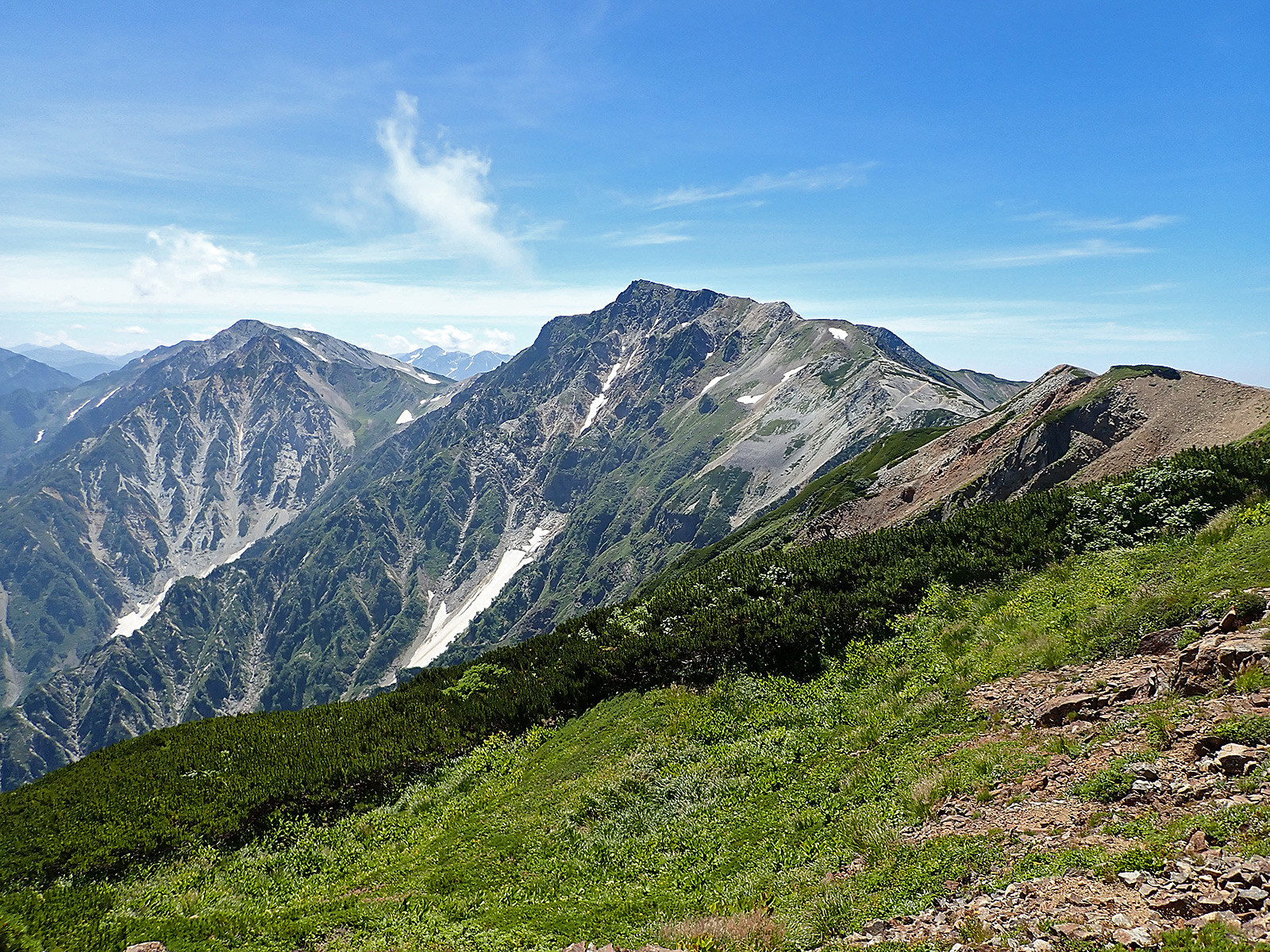 鹿島槍の右側に槍穂高がきれいに見えています。そのさらに右側に遠く見えるのは乗鞍岳かな。