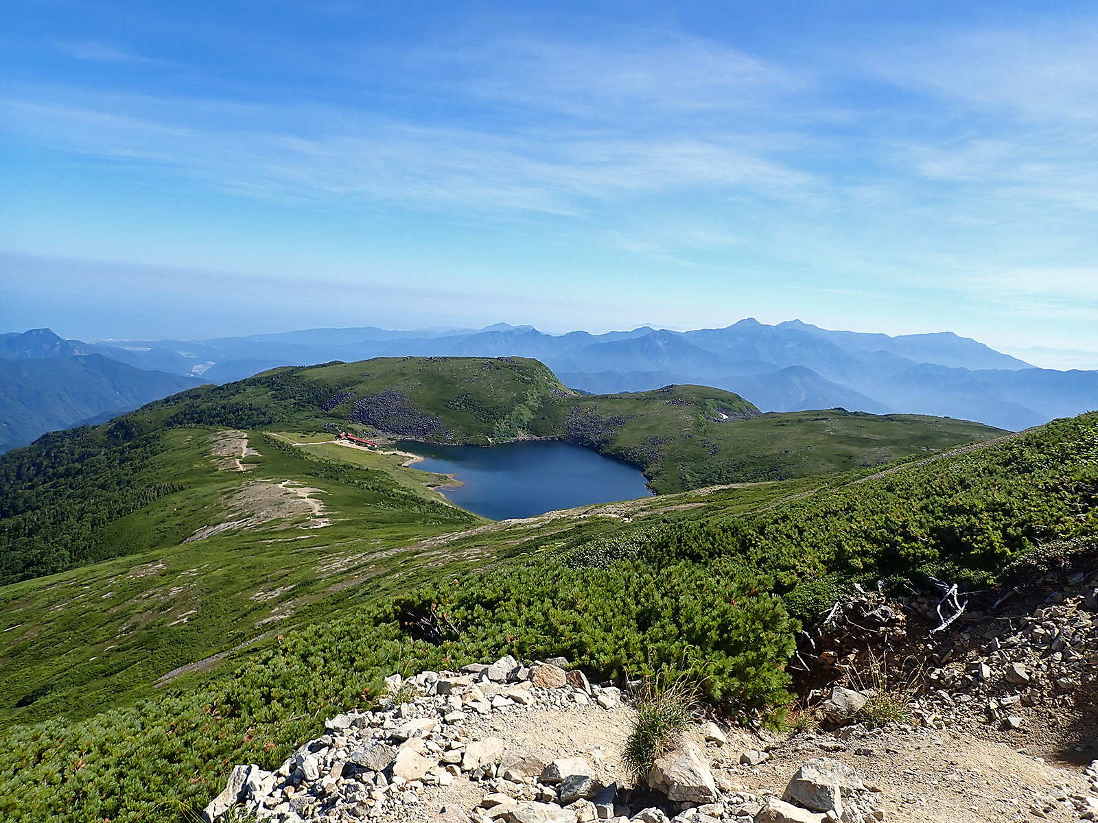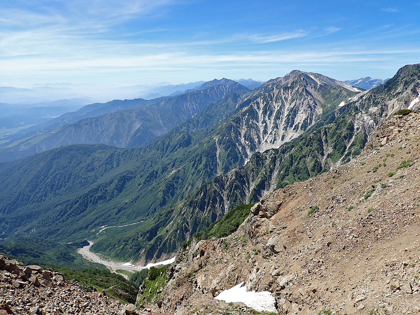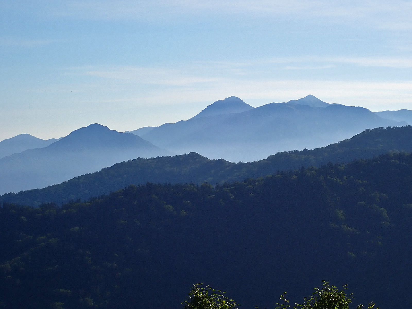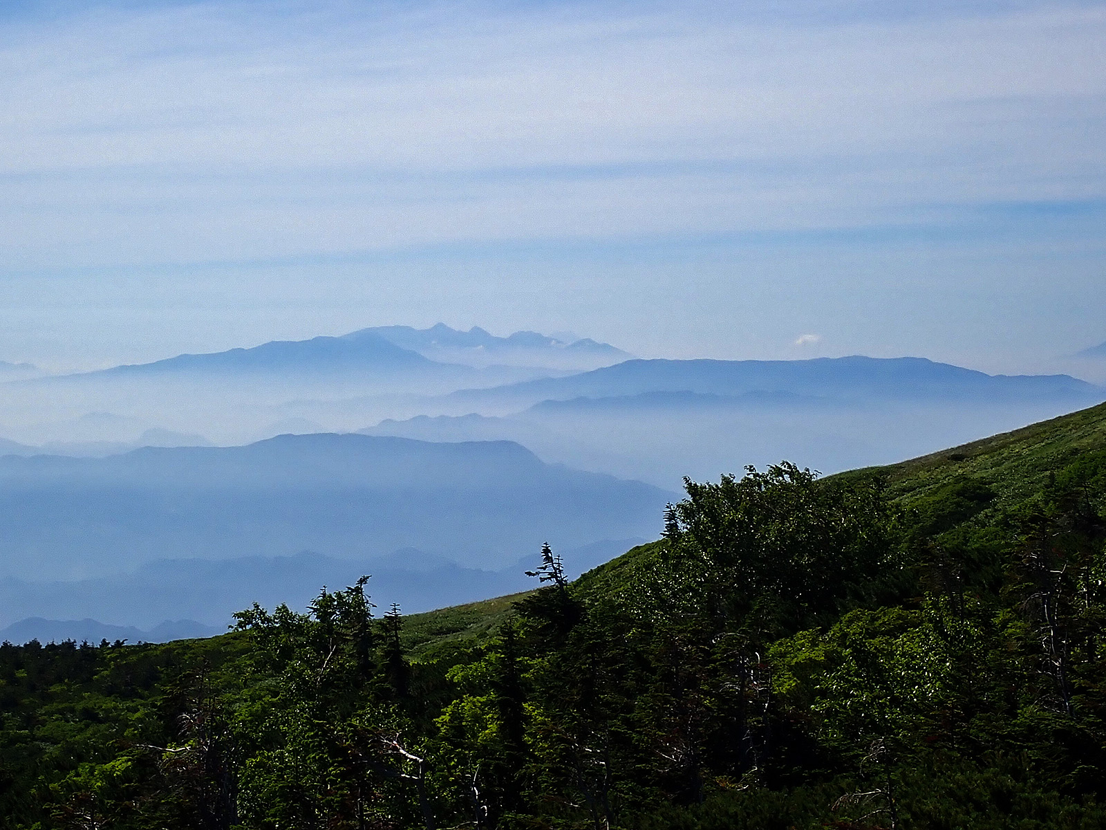 鹿島槍の右側に槍穂高がきれいに見えています。そのさらに右側に遠く見えるのは乗鞍岳かな。
